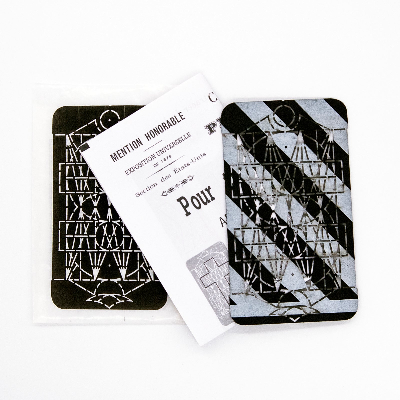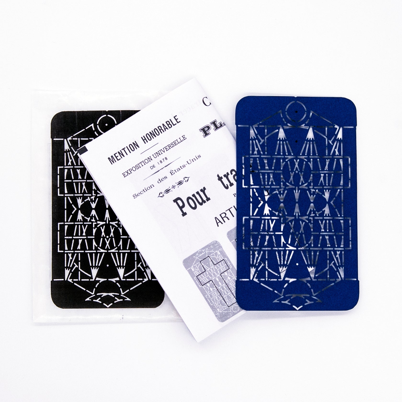 Universal Cut Plate - The Universal Cut Plate was created by engineer Jonathan A. David in 1876 and sold at the Paris World's Fair in 1878, hence its French name. This stencil was designed to draw all uppercase and lowercase letters as well as all possible and imaginable ornaments using its many lines.