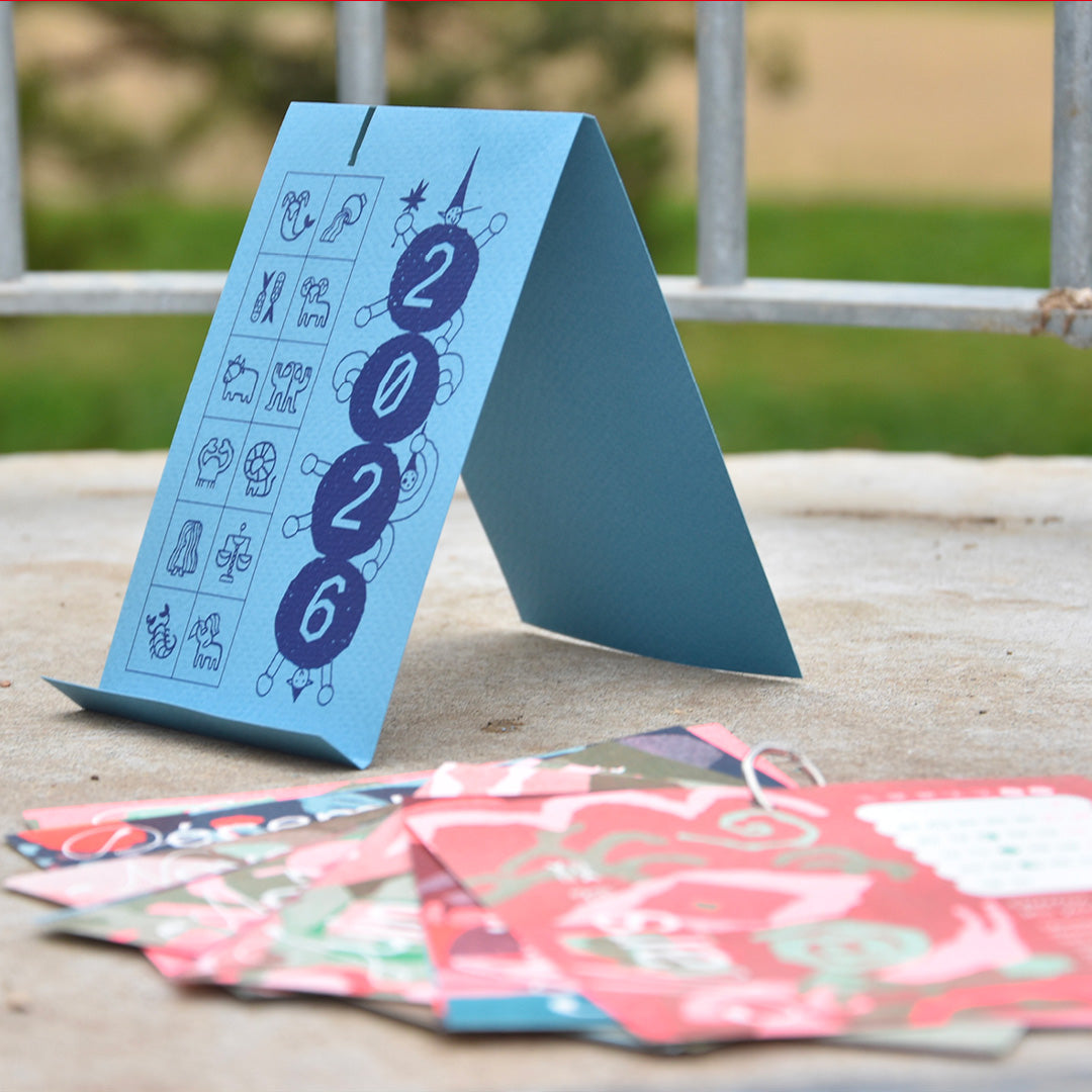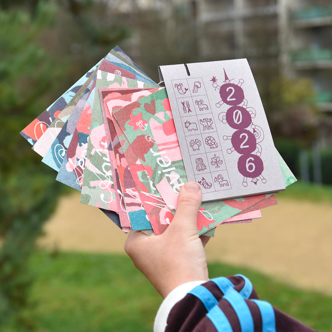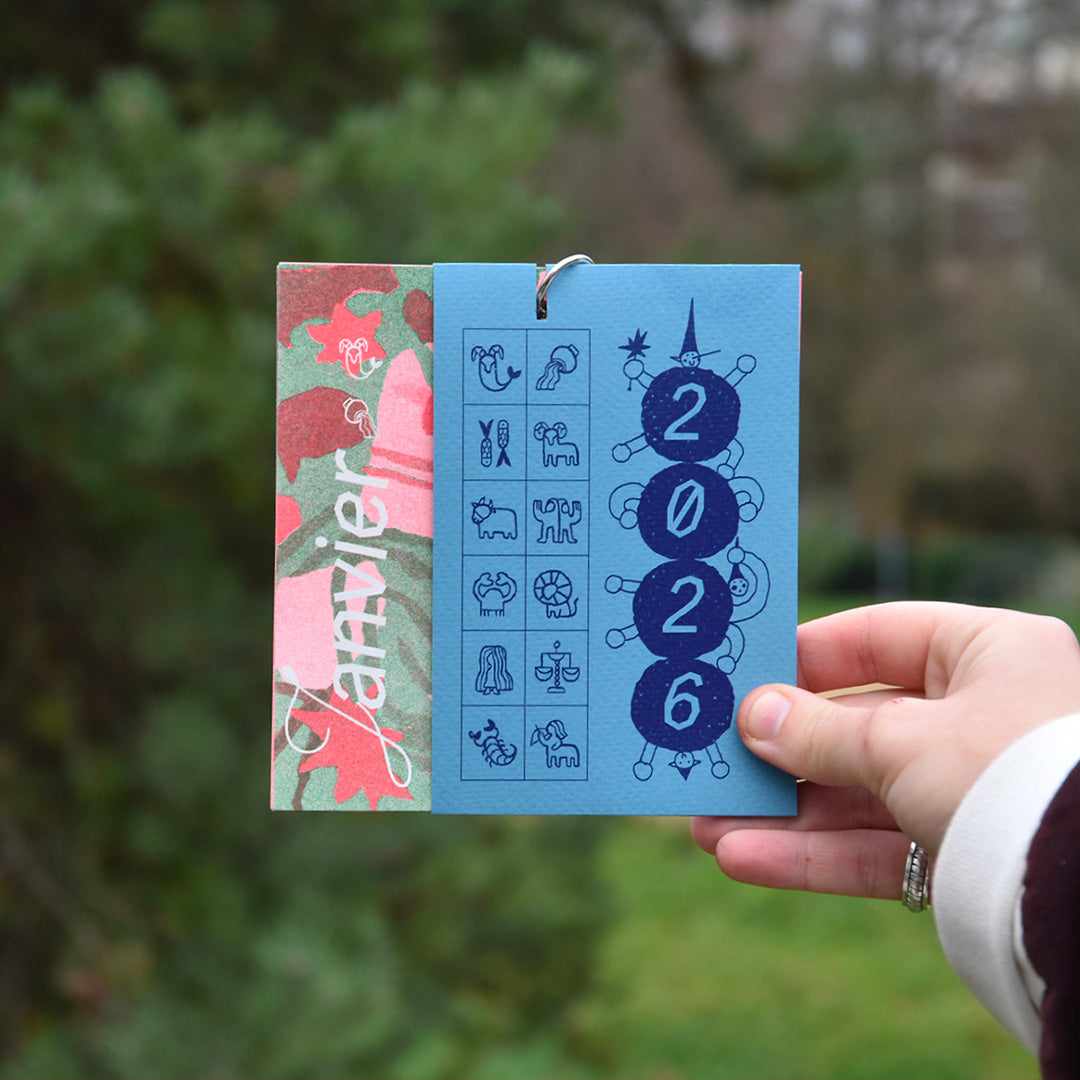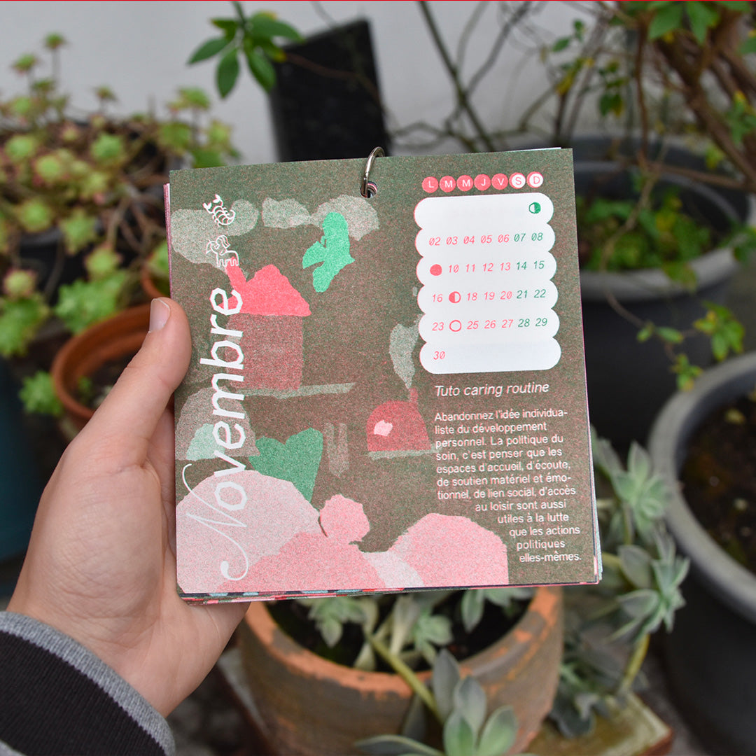 C'est un calendrier avec 1 conseil par mois pour lutter contre le fatalisme politique, retrouver des moyens d’autonomie et de pensée collective pour résister à son échelle. Il est imprimé en risographie en 80 exemplaires numérotés, les illustrations ont été faites en papier découpé, il est relié avec un anneau et il y a une couverture qui se plie pour faire un petit présentoir sur lequel on peut le poser.
