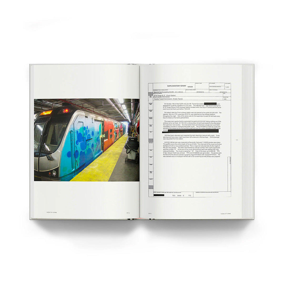 Scene of Crime offre un point de vue inédit sur les graffitis du métro à travers des images et des documents produits par le personnel de sécurité de la Commission de transport de Toronto. Ce livre dévoile une archive institutionnelle cachée remplie de rapports d'incidents et de photographies probantes, offrant un aperçu rare de l'intersection entre les graffitis, l'application de la loi, et la bureaucratie. Remettant en question les conceptions conventionnelles de l'éphémère des graffitis, il révèle comment les photographies et les textes prolongent la durée de vie des graffitis tout en soulignant la dynamique complexe entre les graffeurs et les autorités qui les poursuivent. Avec des essais de Jamie Jelinski, Causr, Euroboi et Liv, le livre donne un nouvel aperçu des implications plus larges des graffitis dans les transports en commun et des preuves produites par ceux qui les enquêtent.