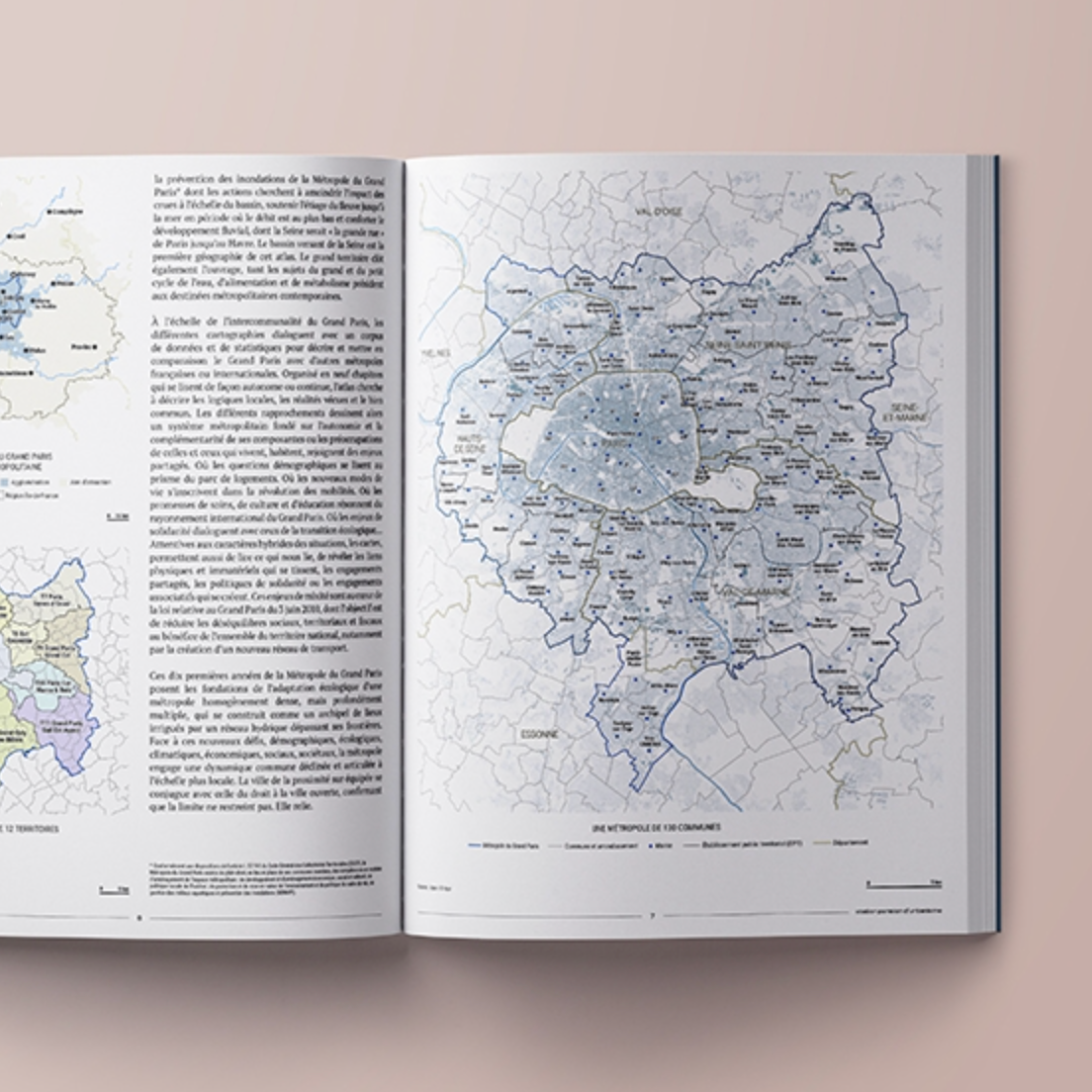 Le recueil de plus de trois cents cartes, réalisé par les équipes de l’atelier avec ses partenaires croise les disciplines aménagement, géographique, environnement, économie, sociale, techniques,… sur le périmètre des 130 communes qui composent la métropole. Les différentes cartographies dialoguent avec un corpus de données et de statistiques pour territorialiser des phénomènes, révéler les grandes dynamiques urbaines et humaines et mettre en comparaison le Grand Paris avec d’autres métropoles françaises ou internationales. Certains sujets dépassent d’ailleurs largement les limites administratives.