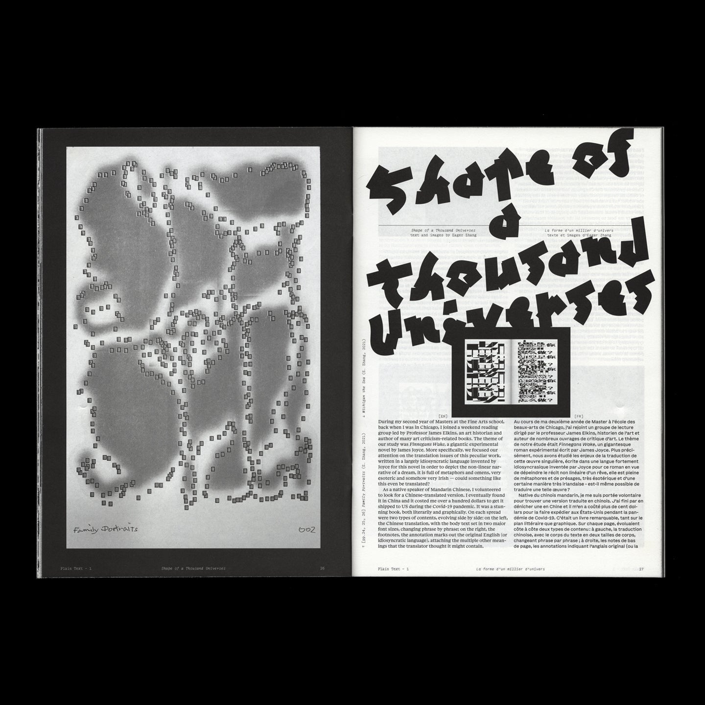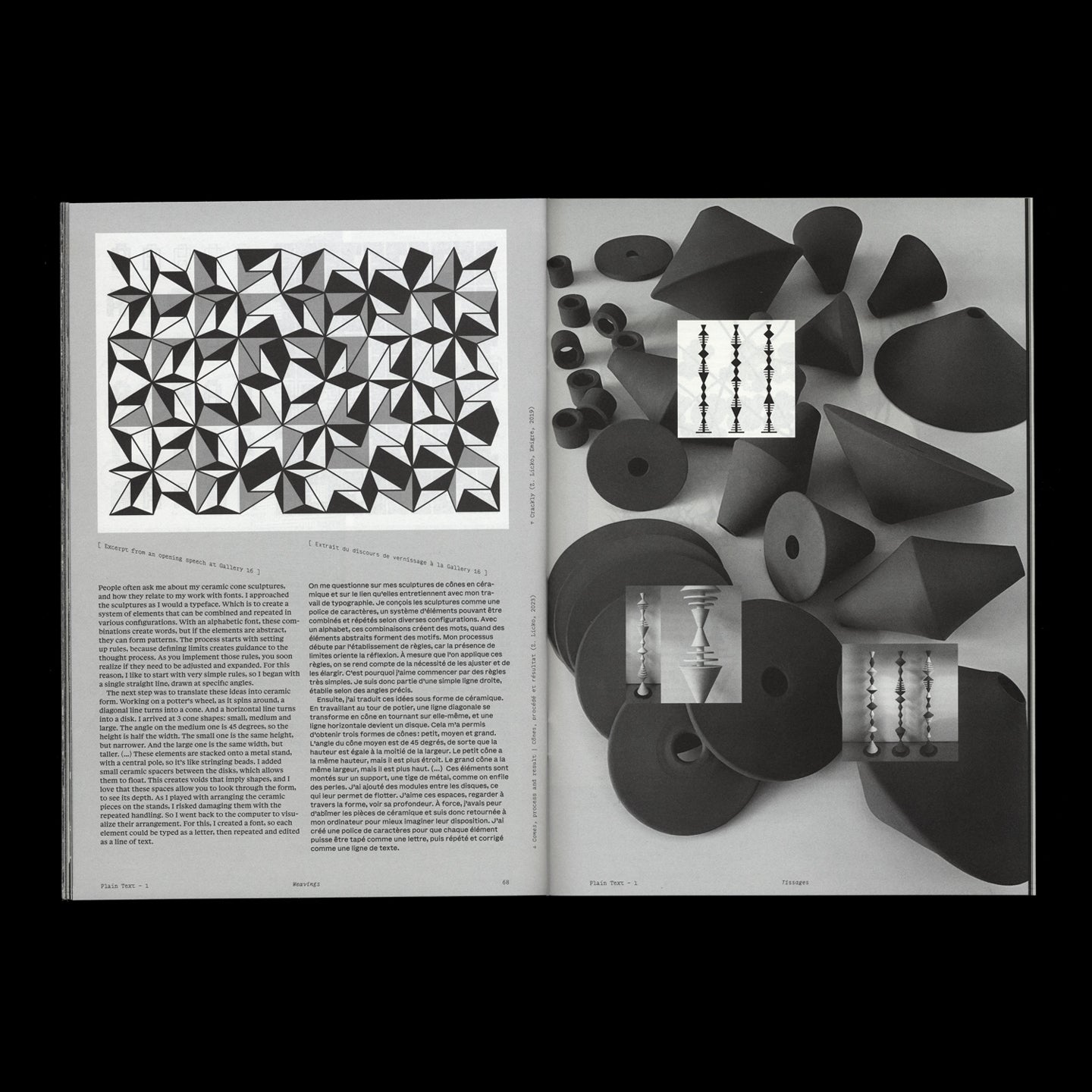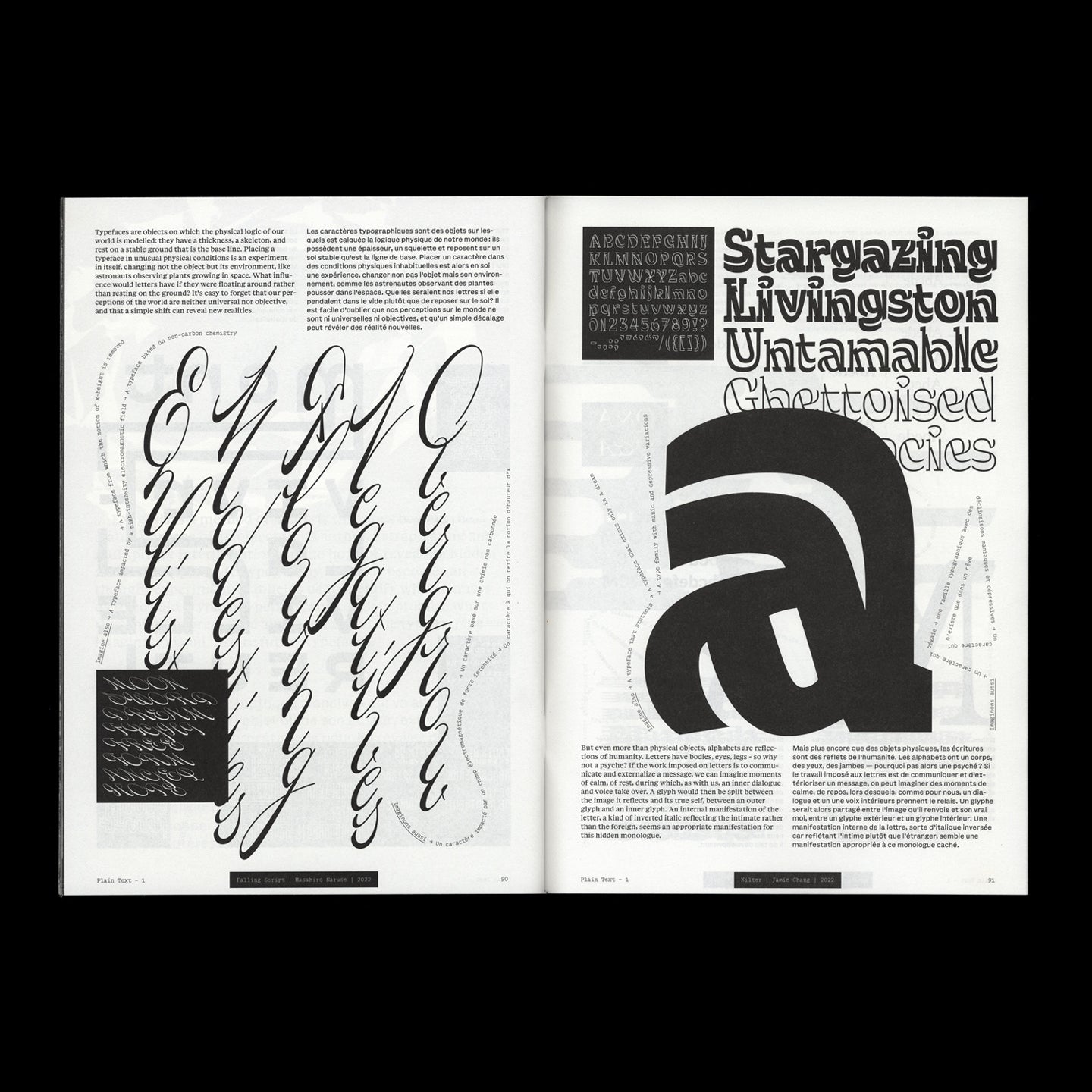 Plain Text est une nouvelle revue de typographie exploratoire, publiée par la fonderie Plain Form. De la fiction à la théorie, d’analyses mystiques à des propositions visuelles, Plain Text se propose d’explorer les imaginaires typographiques en dépassant un cadre strictement historique et technique, avec un attrait pour le potentiel dormant de l’écriture.