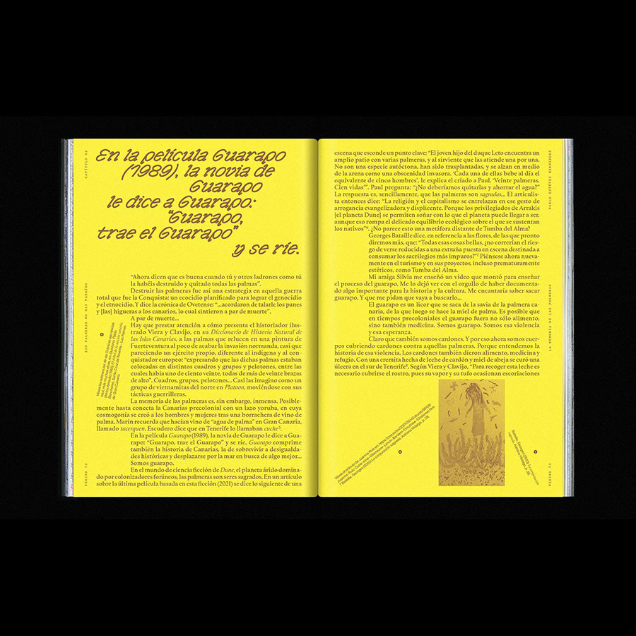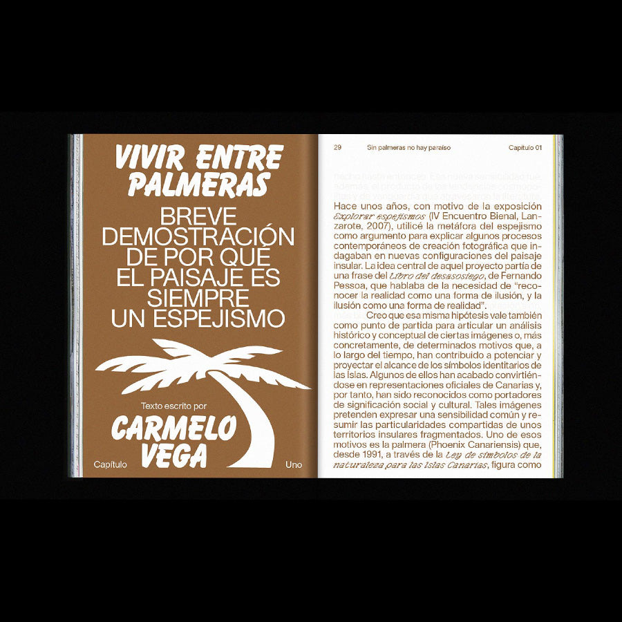 [ENG] Sin palmeras no hay paraíso (Without palm trees, there’s no paradise) is a publication that aims to reflect on the social meaning of the palm tree as an icon of paradise, trying to explore the impact generated by the acceptance of these meanings related to the exoticization of the Canary Islands. The goal is to use the palm tree as an excuse to talk about different current problems of the islands, supported by the voices and images of various artists and writers from the islands.