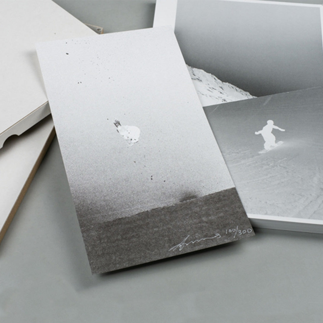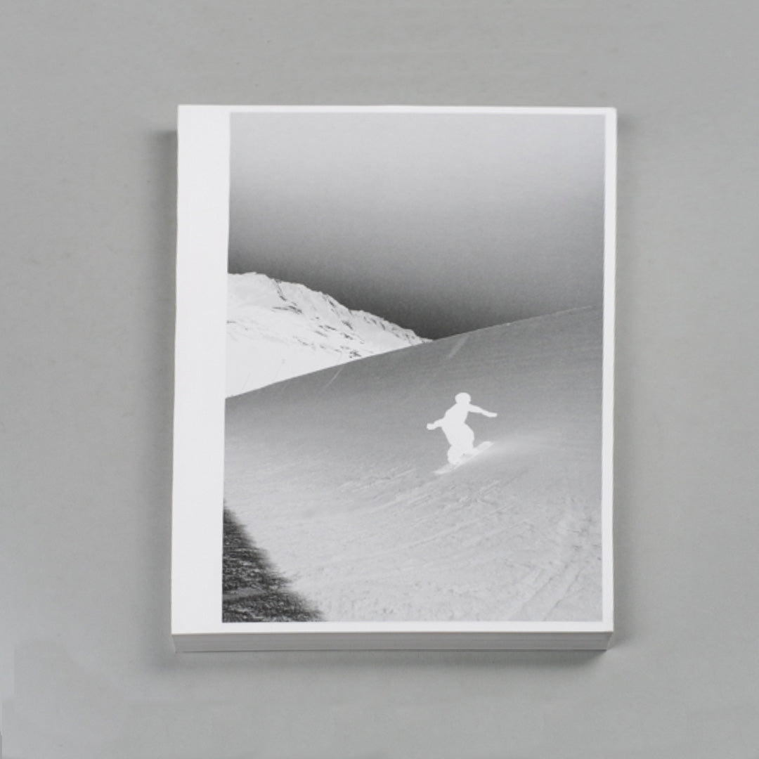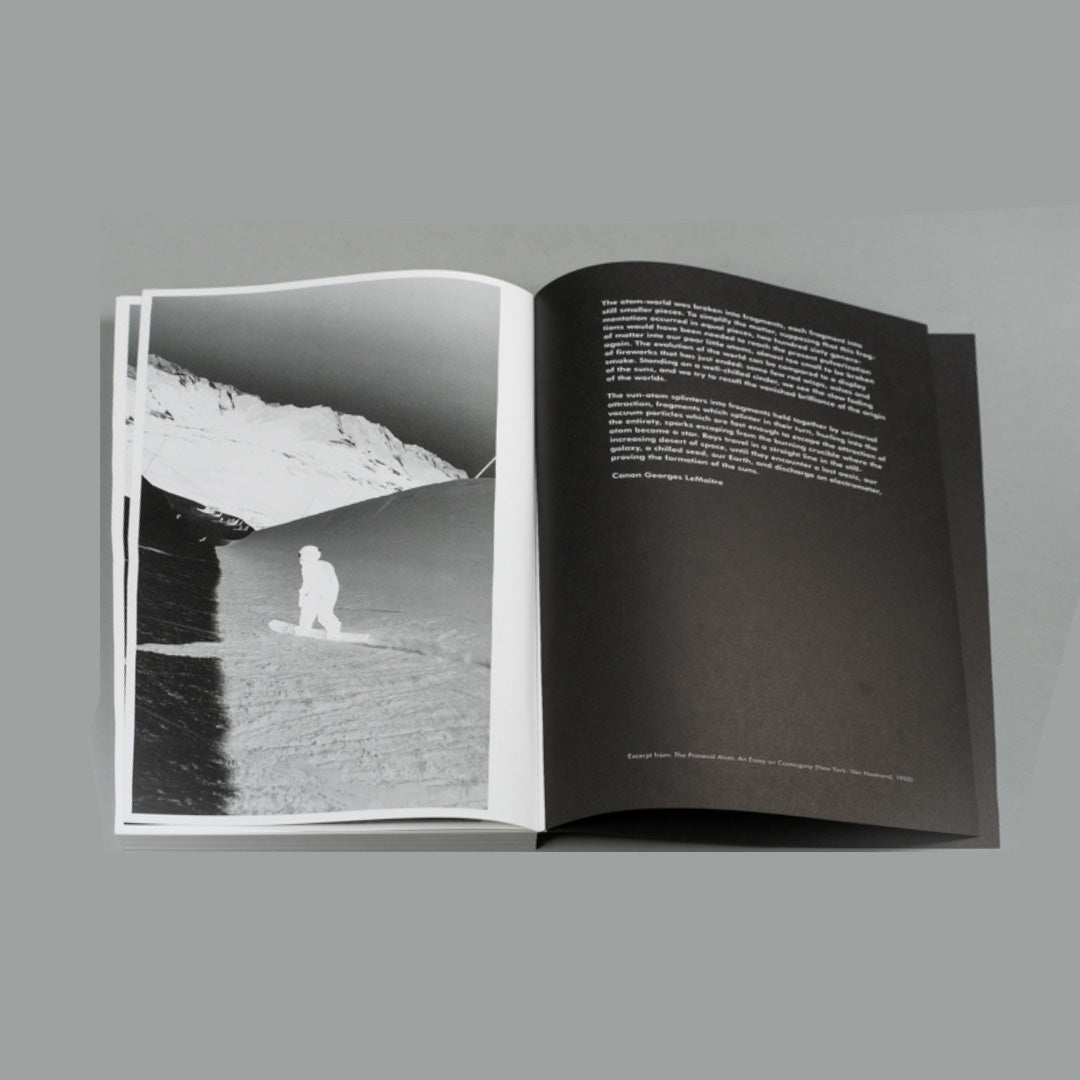 Ari Marcopoulos presents a large-format kineograph of the young Japanese snowboarder Haku Shimasaki performing a technically challenging trick. The idea for the publication came to Marcopoulos after working on his short film ‘Butter’, in which he documents elite snowboarders in Switzerland. He asked a group of them to send him their favourite clips of tricks; this one of Haku, captured by Nishizuka Zensei, stood out. Marcopoulos desaturated the clip and inverted it so it looks like a black-and-white negative. The result is not just an elegant and powerful display of the athlete’s skill – the explosive snow moving around him seems to evoke the dynamic origins of the universe.