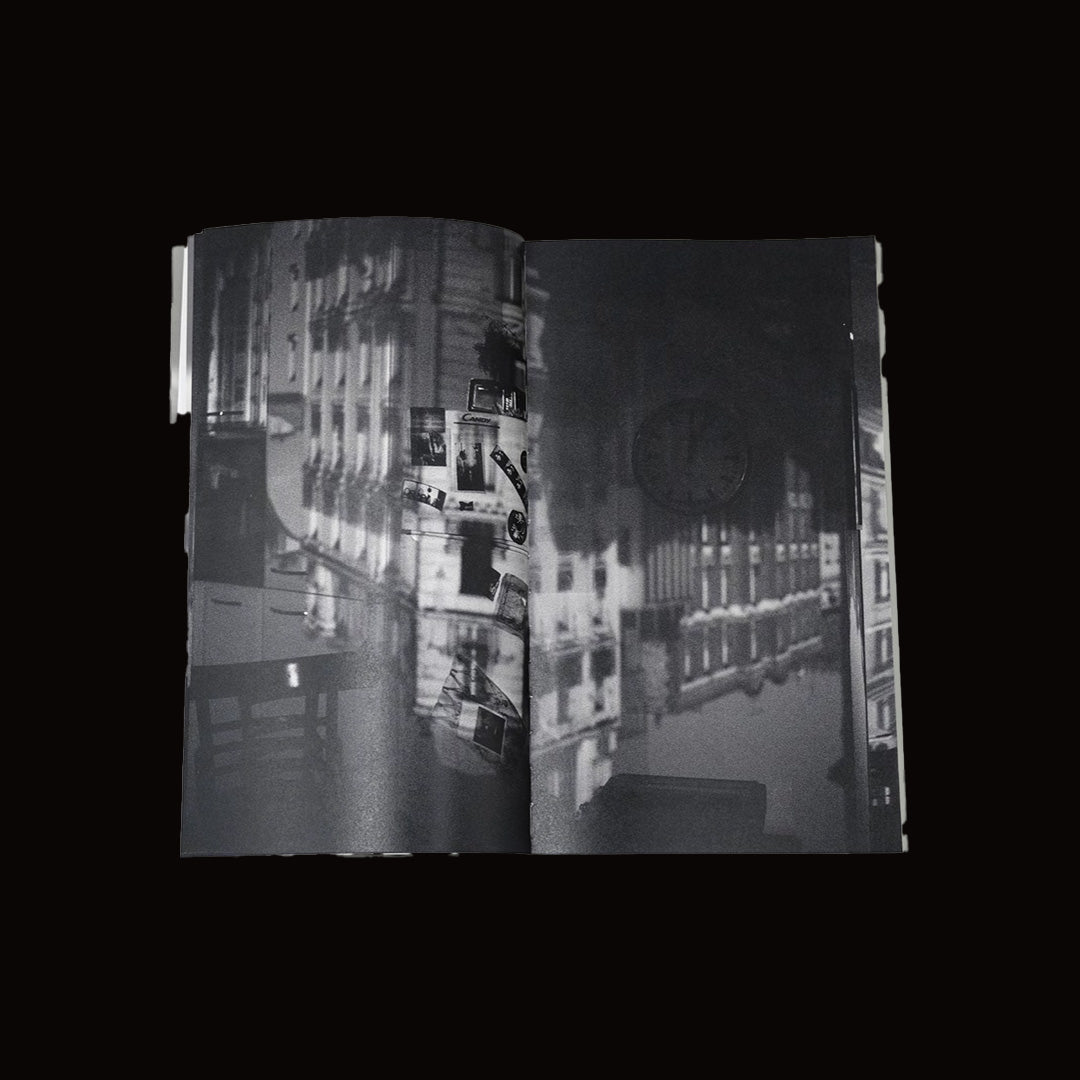 Dans un appartement, les fenêtres ont été soigneusement obturées. Le jour ne pénètre plus. Un minuscule trou dans le rideau noir laisse passer un seul faisceau de lumière : le dehors entre, inversé, fragile, projeté sur les murs, les draps, les corps. Le lieu devient chambre noire, espace d’écoute et de dérèglement du regard. Le projet naît du désir d’explorer l’intangible — la trace, le souvenir, l’éphémère — et de poursuivre une recherche autour de la perception et du temps. Ici, le réel s’invite sans filtre, mais se transforme. Les images du monde apparaissent lentement, tremblées, mouvantes. Un passant devient apparition, une voiture au plafond se fait personnage. Le temps se dilate, les sons s’épaississent, l’ennui s’installe et ouvre une brèche, celle du peu, du presque rien. Dans cette obscurité habitée, il ne s’agit plus de capturer une image, mais de la laisser advenir. La lumière devient matière poétique, la lenteur une forme d’attention. Chaque instant suspendu révèle la fragilité du visible et l’étrangeté du familier. Le livre restitue cette expérience à travers un ensemble d’images et de fragments narratifs écrits à quatre mains. Des photographies argentiques prises dans la Camera Obscura et d’autres en négatifs obtenues en apposant du papier photosensible directement sur les murs de l’appartement. Il propose une expérience sensible, une nouvelle manière d’habiter le vide, de regarder autrement, d’accueillir l’éphémère.
