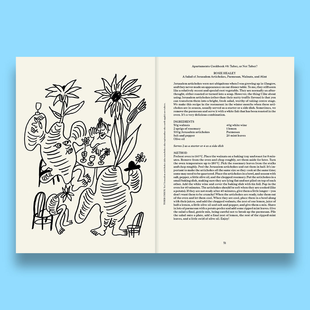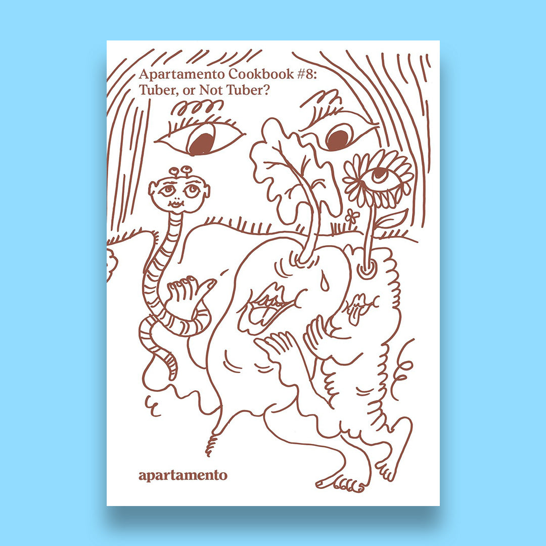 Apartamento Cookbook #8 - Tuber ou ne pas tuber ? Telle est notre question. Dans le livre de cuisine annuel d'Apartamento de cette année, nous reprenons les célèbres lignes de Hamlet de Shakespeare et nous nous demandons ce qu'est un tubercule. Alors que les livres de cuisine précédents faisaient directement référence aux aliments de base du garde-manger, aux épices ou aux sucreries, le livre de cuisine Apartamento #8 : Tuber, or Not Tuber ? invite les lecteurs à s'interroger sur ce qu'il faut faire ou ne pas faire dans le monde culinaire, en répondant par des recettes qui font appel à toute une gamme de légumes-racines. Chaque recette est accompagnée d'un « Tuber Check », qui joue avec le livre de cuisine standard et présente aux lecteurs un éventail de délices souterrains, qu'ils soient ou non des tubercules.