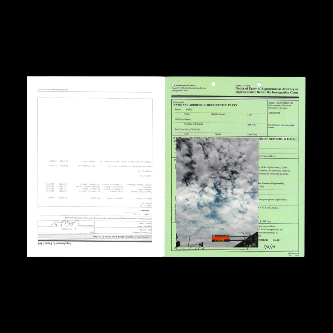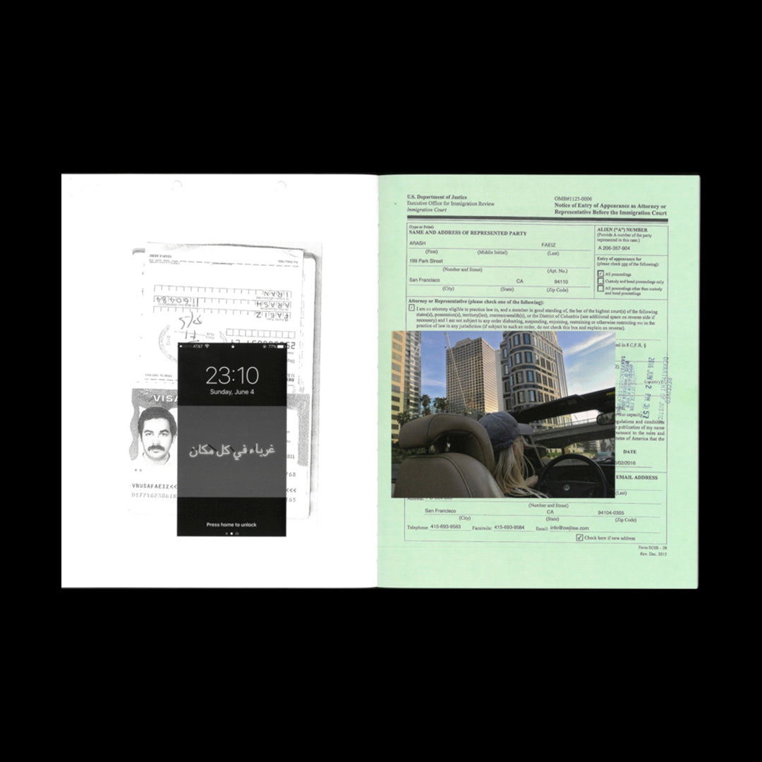 Apolis - Lauréat du DUMMY BOOK AWARD Arles 2023. Apolis est une autobiographie visuelle de la vie d'Arash Fayez entre 2014 et 2018. Le livre regroupe le dossier d'immigration américain complet de l'artiste, depuis son arrestation par les forces de l'ordre jusqu'à son départ volontaire du pays. Apolis présente des documents officiels superposés à des photos de smartphone de la vie quotidienne capturées au cours de la même période. Les photographies sont superposés à des sections du dossier d'immigration, dissimulant des informations personnelles et sensibles. Cette juxtaposition crée une narration à plusieurs niveaux, révélant des perspectives contrastées - de ceux qui détiennent le pouvoir et de ceux qui n'en ont pas. Le projet est né d'une conversation entre l'artiste et son avocat spécialisé dans les questions d'immigration, dont l'explication succincte de son statut juridique résume la complexité de la situation : « Vous n'êtes pas illégal, mais vous n'êtes pas légal non plus ».