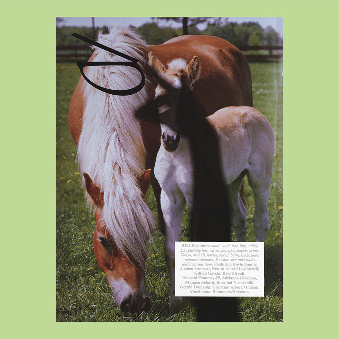 Bill 5 - "Bill" est un magazine annuel qui privilégie la lecture visuelle de ses récits photographiques, sans distraction textuelle. Ce numéro contient 192 pages offset imprimées en CMYK, argentique et noir et blanc sur une douzaine de papiers différents, ainsi que quelques signatures reliées à la japonaise. Conçu, édité et produit par Julie Peeters et la rédactrice en chef adjointe Elena Narbutaite, il comprend des contributions de Ketuta Alexi-Meskhishvili, de la cinéaste Gillian Garcia, de l'artiste visuel suisse Beat Streuli, de Takashi Homma, d'Adrianna Glaviano, de l'artiste visuel français Mimosa Echard, de l'artiste britannico-palestinienne Rosalind Nashashibi, de Martiniano shoes et du studio de photographie d'Amsterdam Blommers/Schumm.