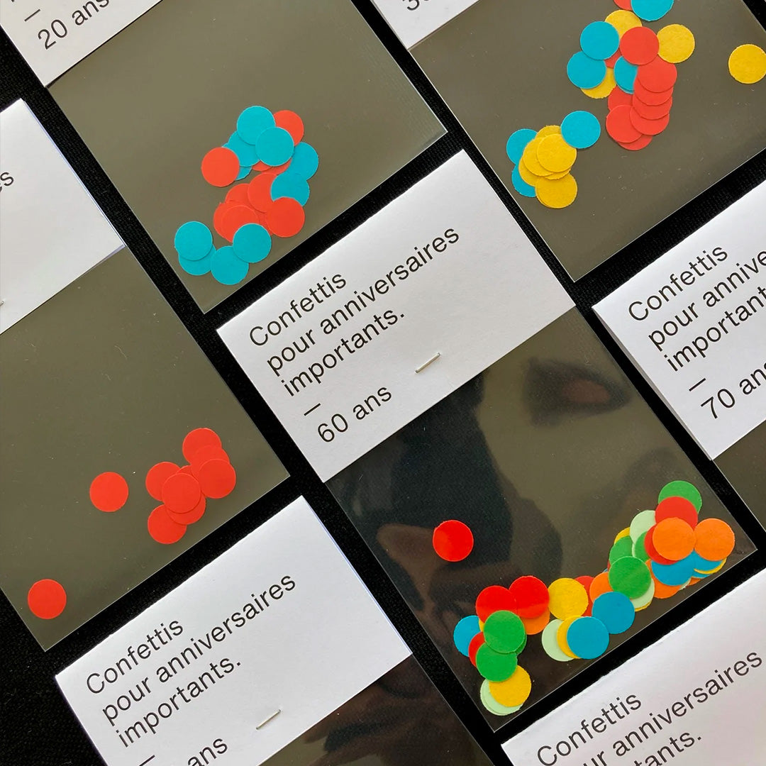 Pochettes de confettis pour célébrer les anniversaires mémorables. Chaque confetti représente une année passée et chaque couleur une nouvelle décennie. Plus le temps avance, plus les couleurs se multiplient. De 10 à 90 ans pour un total de 6850 confettis.