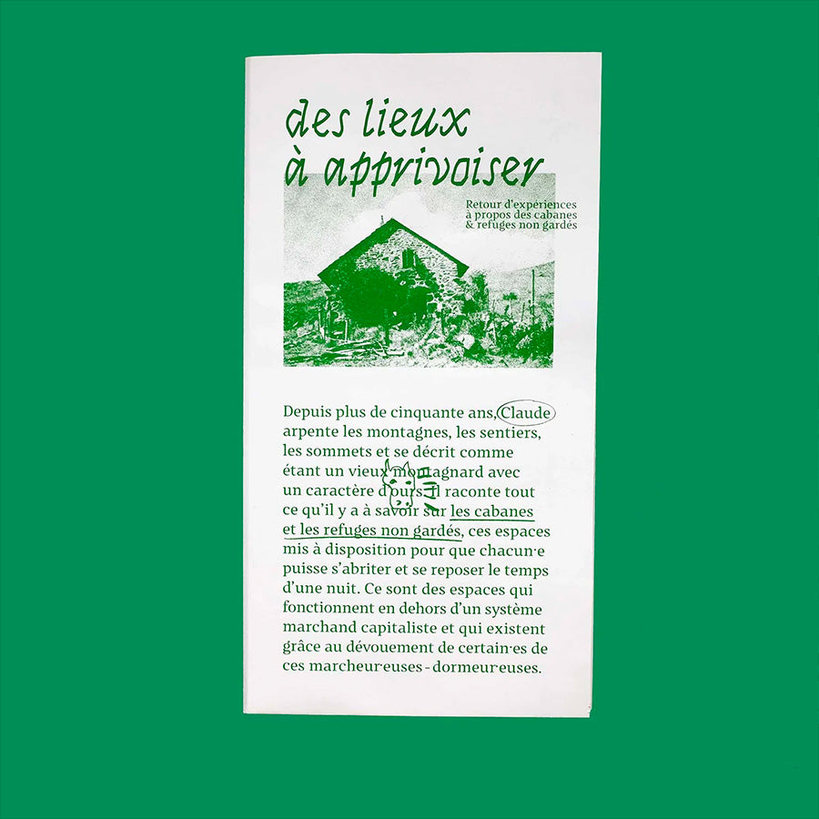 Cette édition-affiche rapporte les paroles de Claude, un montagnard passionné que j’ai rencontré par hasard sur le forum refuge.info. Il y raconte tout ce qu’il y a à savoir sur les cabanes et refuges non gardés en montagne avant de partir à l’aventure. Les petites photos viennent du site refuges.info et le paysage plus grand imprimé au verso est une de mes photos agentiques. Les dessins, qui ponctuent le texte sont des relevés que j’ai faits du cahier d’un refuge en Ariège. J’ai fait cette édition en pensant aux posters touristiques et aux carnets de voyage avec la volonté de donner envie aux lecteurs d’aller randonner et dormir en refuge non gardés, des lieux d’hébergements hors des échanges monétaires.