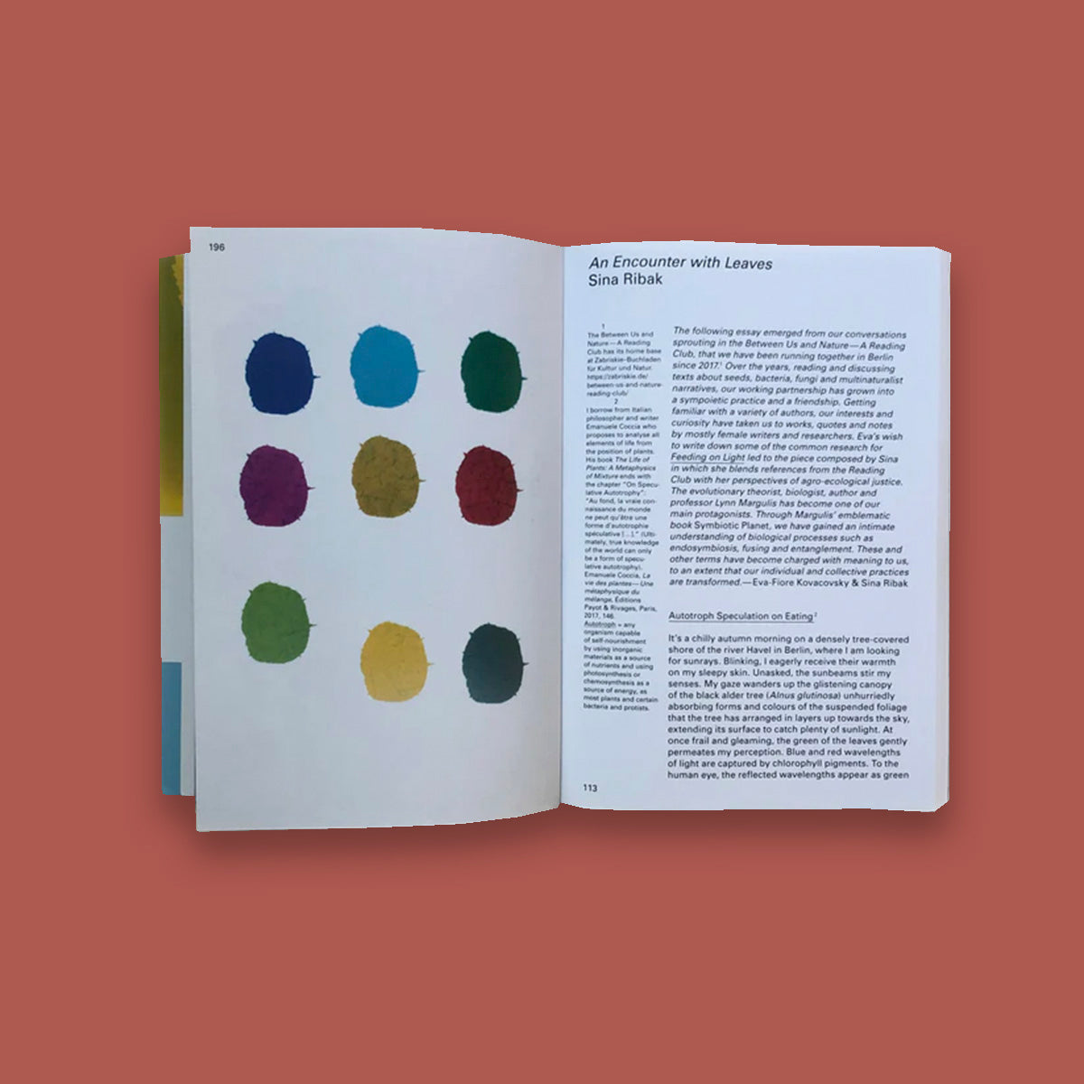 Feeding on Light - Imagine a collection of perforated leaves in which organisms such as insects, fungi or bacteria present in the foliage have created a whole series of patterns. The work "Feeding on Light" by Eva-Fiore Kovacovsky examines photosynthesis through experimental photography. Bringing the outdoors into his analogue colour darkroom, the artist captures traces of the often symbiotic relationships observed between trees, insects and the sun. The book takes the form of a a field guide, with a comprehensive index of common and scientific plant names that links the hundreds of photograms, contact prints, and negatives. Essays contextualize his work through biology, ecology, and philosophy.