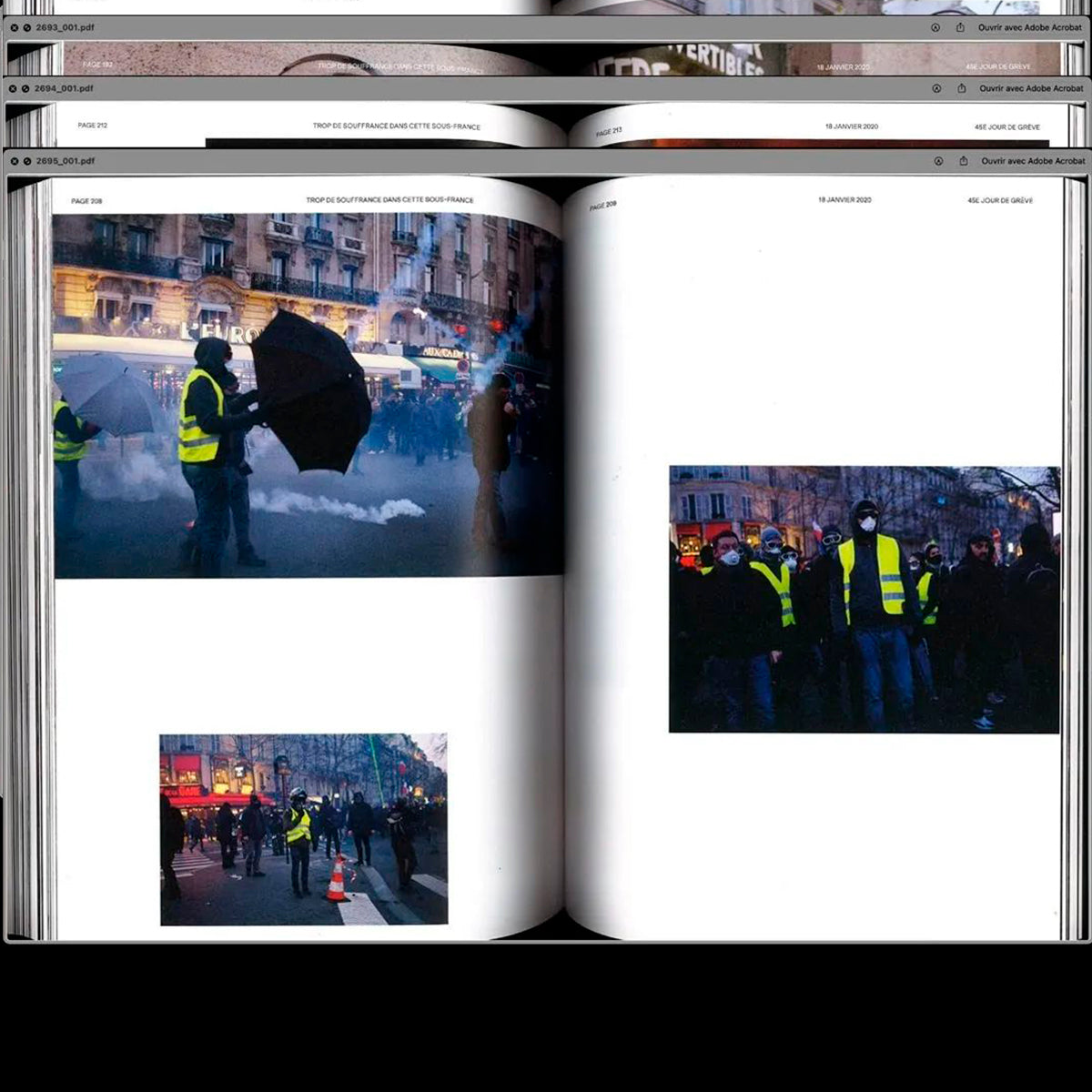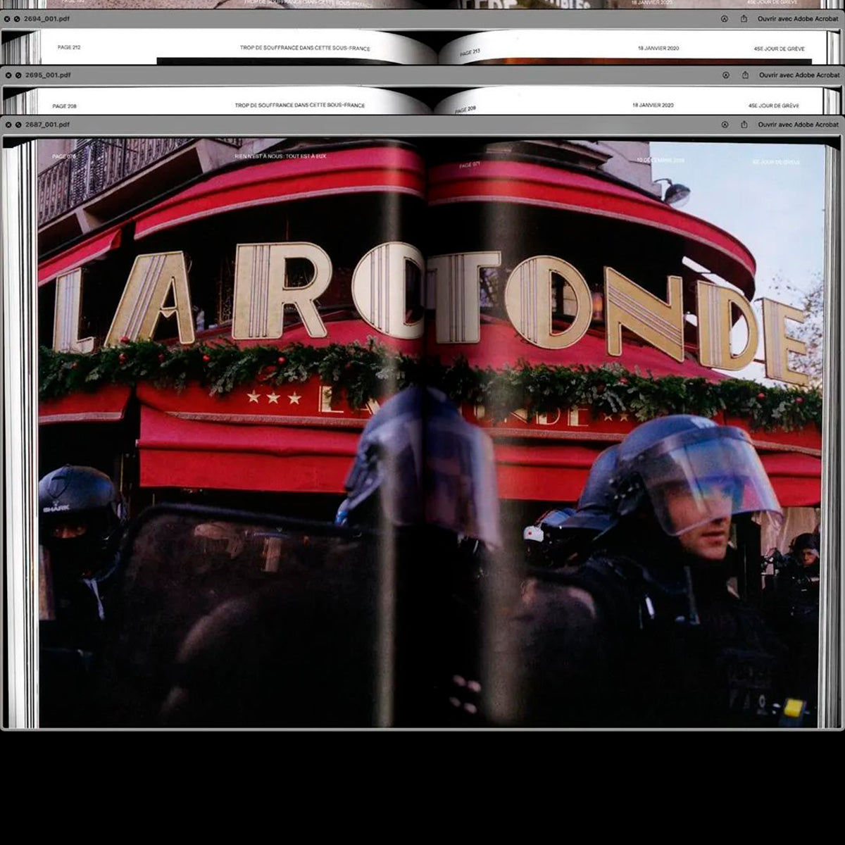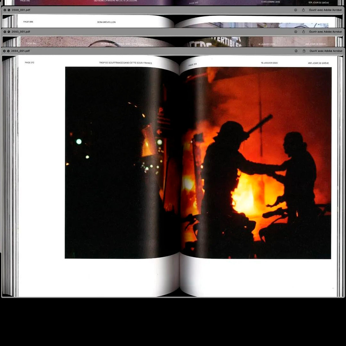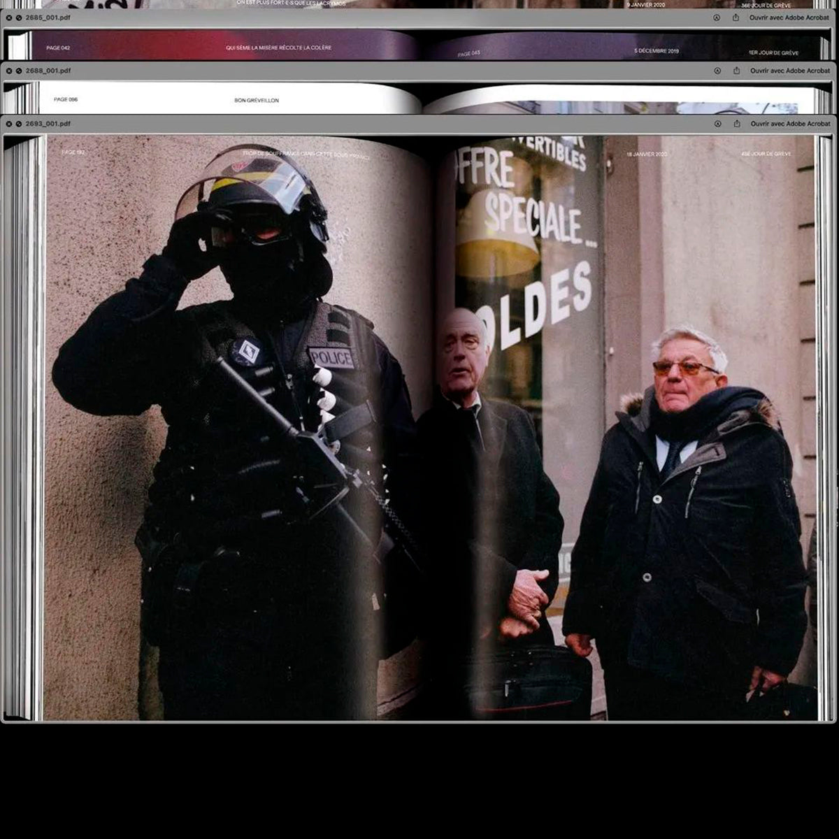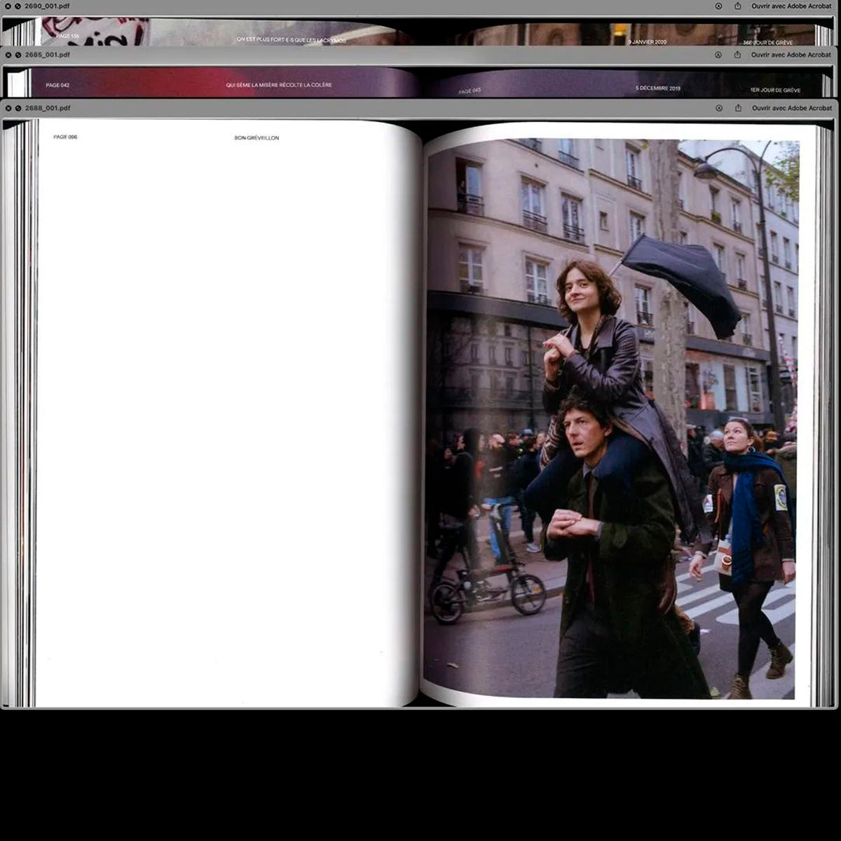 Grève générale 2019-2020 s’est constitué autour d’un triptyque image/texte/design graphique, dans le souci de retranscrire un climat général, un rythme propre aux manifestations, le point de vue des manifestant·e·s... et ceci tout en gardant comme ligne directrice la lisibilité de l’ouvrage. Il a fallu restituer les clichés dans leur contexte et reprendre les faits dans leur ordre chronologique, préalable nécessaire pour en établir la valeur historique. Le livre Grève générale souhaite faire en sorte que ce mouvement social ne tombe pas dans l’oubli – du fait de la densité de l’actualité politique et sociale qui abreuve constamment le flux médiatique. L’« archive » est un concept ouvert ; à nous d’y faire rentrer ce qui nous paraît important, de construire l’Histoire que nous espérons pour demain.
