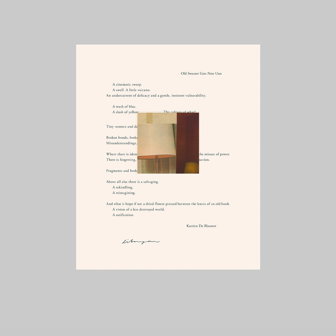 Katrien de Blauwer : Old Sweater Gets New Uses - C'est l'histoire de trois maisons, de trois femmes et de trois chambres. Les maisons sont situées dans la même rue. Chez mes parents, j’ai une chambre séparée avec un grand placard. Chez ma grand-mère, je partage le lit avec elle. Chez les voisins, il y a deux chambres : une grande et une petite. Parfois nous dormons dans le même lit. Je rêve toujours de ne pas pouvoir nettoyer ma chambre chez mes parents, ni trouver mes vêtements. Ils doivent être dans l’une des trois chambres. -Katrien De Blauwer (n. 1969, Belge) « C’est comme passer devant une maison où vous viviez : le fait qu’elle existe encore, si concrète, rend tout ce qui s’est passé depuis un peu insubstantiel. » – Rachel Cusk, extrait de Outline