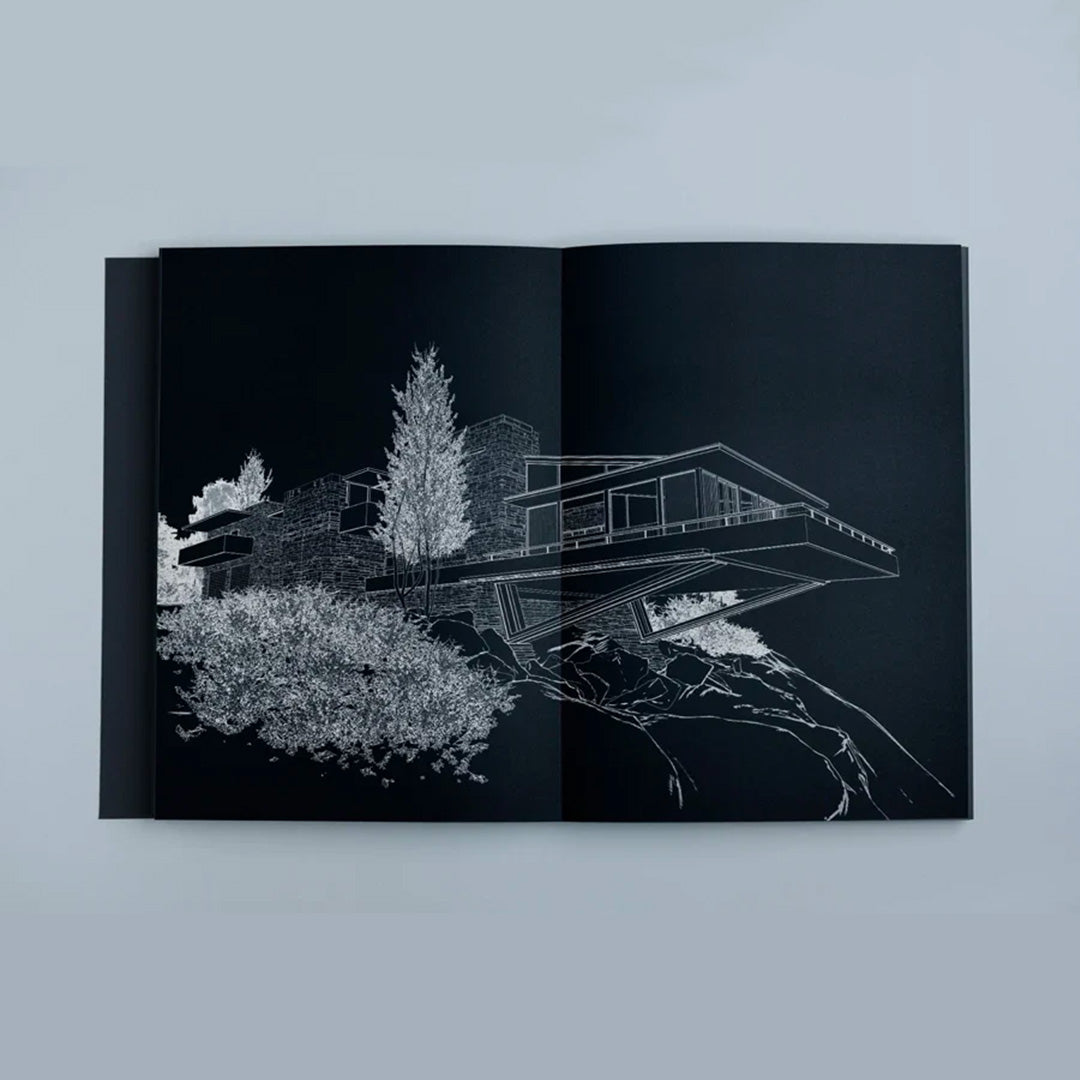 argentée sur un luxueux papier noir, explore la conception architecturale de