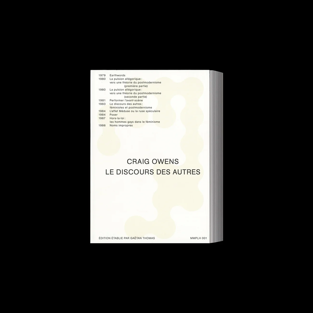 Craig Owens (1950-1990) a bouleversé la théorie de l’art en une décennie d’intense travail. À la fin des années 1970, aux États-Unis, il s’engage dans l’aventure intellectuelle postmoderne, en quête d’alternatives à un discours moderniste cramponné aux problèmes formels. Owens se penche sur des pratiques artistiques conçues à la croisée des médiums, comme celles de Robert Smithson ou de Trisha Brown. Lecteur des philosophes poststructuralistes, il soutient que les oeuvres se composent de signes ouverts à l’interprétation. Owens place ainsi les spectateur·ices au premier plan, tout en apportant une inscription théorique inédite aux performances de Laurie Anderson et aux oeuvres postconceptuelles de Barbara Kruger, Cindy Sherman, Sherrie Levine ou Martha Rosler. Attentif au genre des artistes et inspiré par des réflexions sur le pouvoir du regard masculin, Owens écrit ensuite sur le féminisme et la domination. Ses essais prennent une tonalité sociale et politique. Ils touchent aussi à des questions ouvertes par les études postcoloniales. Autant de recherches interrompues par le sida, dont Owens meurt en 1990.