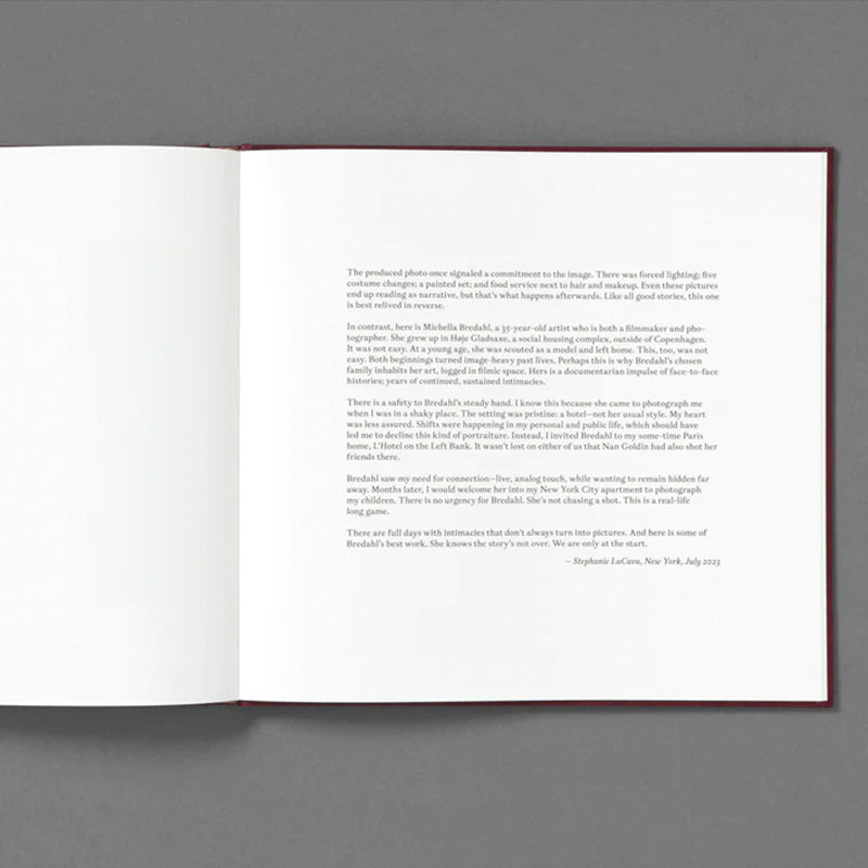\nComme la lignée des femmes portraitistes influentes qui l'ont précédée - Goldin, Day, Sarfati et Lawson, pour n'en citer que quelques-unes -, les portraits de Bredahl naissent d'une introspection et d'un examen de conscience, trouvant les parties manquantes d'elle-même dans les regards arrêtés, les poses langoureuses et les espaces intimes des autres. Élevée dans un environnement familial turbulent au sein du quartier résidentiel vulnérable de Høje Gladsaxe, à l'extérieur de Copenhague, l'artiste s'est finalement retrouvée devant l'appareil photo, repérée comme modèle à un âge précoce : objectivée, regardée, soumise aux caprices des hommes et du pouvoir.