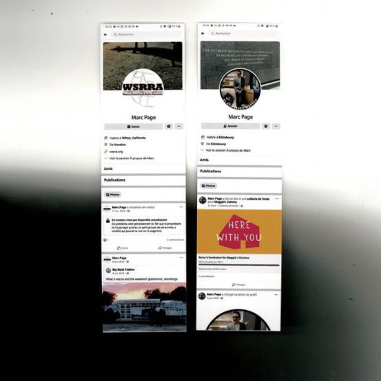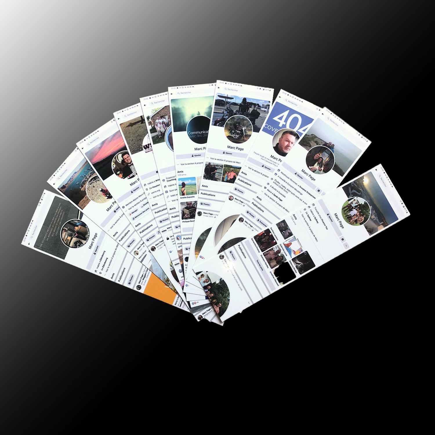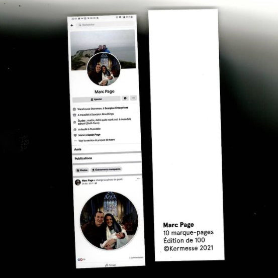 Mark Page - Une nouvelle édition de 10 marque pages bien nommés, éditée en 250 exemplaires. Chaque marque page présente une capture d'écran mobile du profil Facebook public d'un Mark Page.
