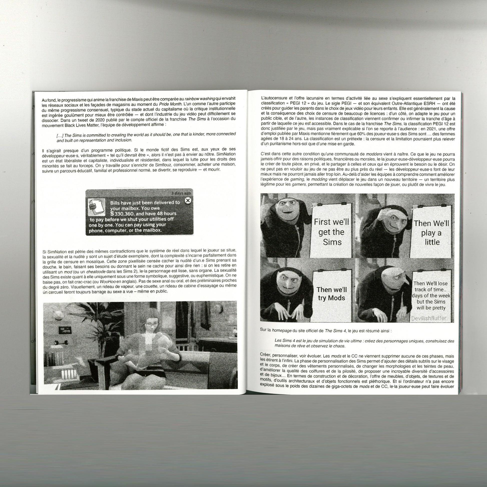\n"S'initier au modding des Sims, c'est pénétrer dans un gouffre sans fond qui ressemble à la vie, et dans lequel le gamer se perd avec la joie d'un démiurge. En somme, le modding fait glisser The Sims 4 du gaming au playing. Cette distinction effacée par la langue française est éclairante : quand le game suppose la description et l'obéissance à des règles, le play, lui, implique une absence de règles formalisées et un effacement des enjeux explicites. Par son offre quasi infinie de modding, The Sims 4 devient un jeu de type sandbox dans lequel seules la volonté du gamer peut mettre fin au jeu, et seule la fatigue peut le mettre en pause.