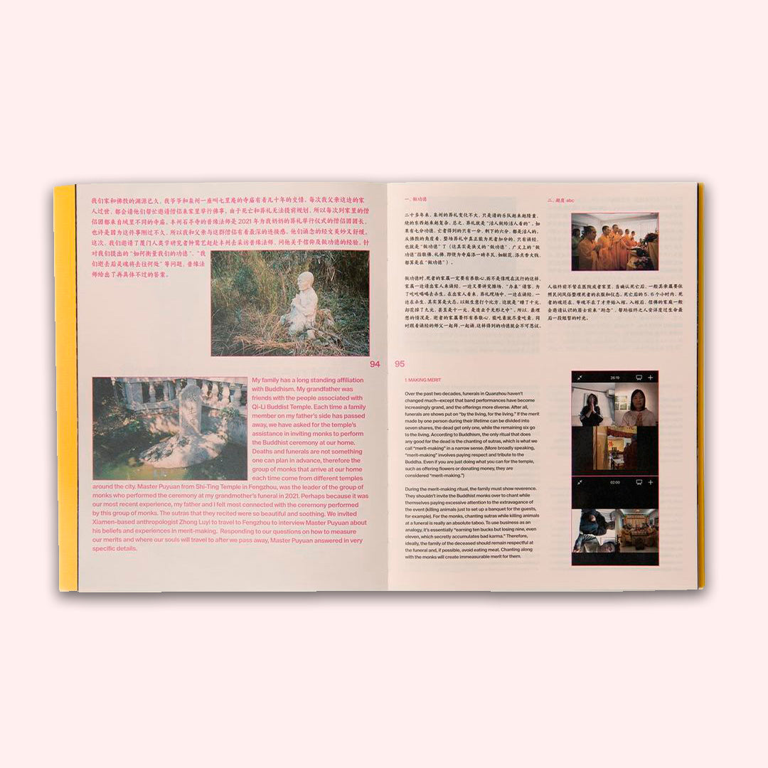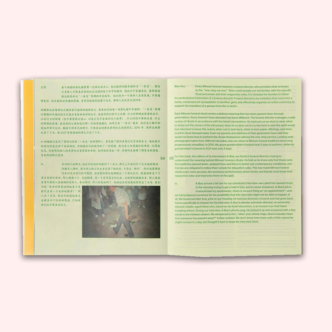 Minnan Exit - Depuis 2015, Wen-You Cai (née en 1989) est retournée à plusieurs reprises dans la ville natale de ses parents, Quanzhou, dans le Fujian, pour assister aux funérailles de membres de sa famille. Les cérémonies dans la région de Minnan se déroulent comme de grands drames dans lesquels elle est à la fois observatrice et participante. Tout au long de la cérémonie, Wen-You est enveloppée dans l'inconnu ; tout semble méticuleusement arrangé. Dans le chagrin accablant de la perte d'êtres chers, il existe un sentiment de confusion, et prendre des photos a été pour elle un moyen de s'engager dans le processus funéraire. Pour cette série de photos, Wen-You a d'abord été confrontée à sa propre peur de la mort, mêlée à sa perplexité et à sa curiosité à l'égard des rituels funéraires complexes et de leur caractère unique inhérent à la culture Minnan. Pour démystifier ces sujets, Wen-You a interviewé un entrepreneur de pompes funèbres qui propose des services complets, un moine qui organise des cérémonies bouddhistes et un folkloriste des rituels Minnan. Minnan Exit est à la fois un album de famille, une collection de photographies, un voyage de découverte inachevé et une chronique de la réconciliation de Wen-You avec sa mortalité.