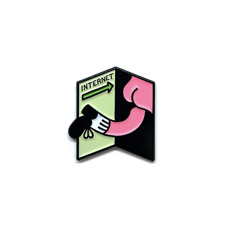 \nExit Pin neuf en émail, finition noire, produit par Internet Pin Company et créé en collaboration avec l’illustrateur français Simon Landrein.