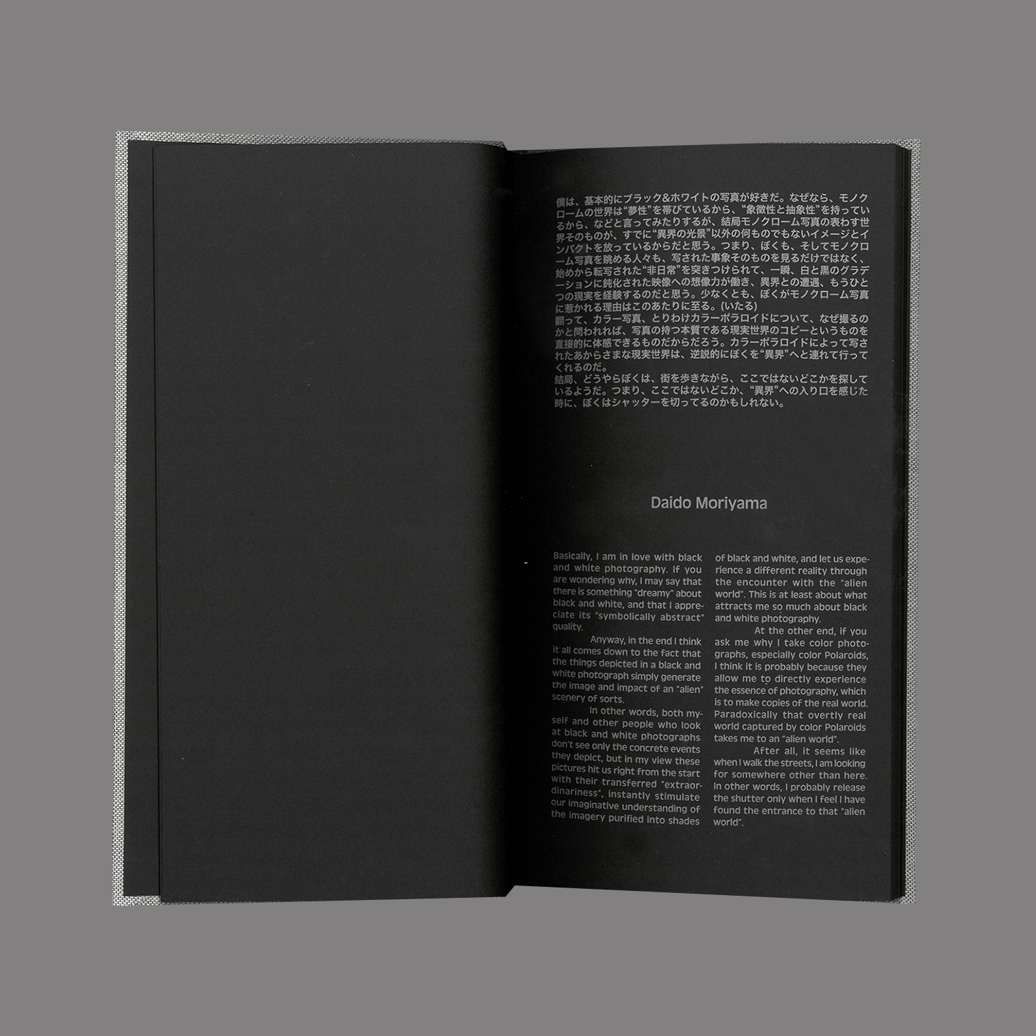 \nAfter all, it seems like when I walk the streets, I am looking for somewhere other than here, in other words, I probably release the shutter only when I feel I have found the entrance to that ‘alien world’.” - Daido Moriyama