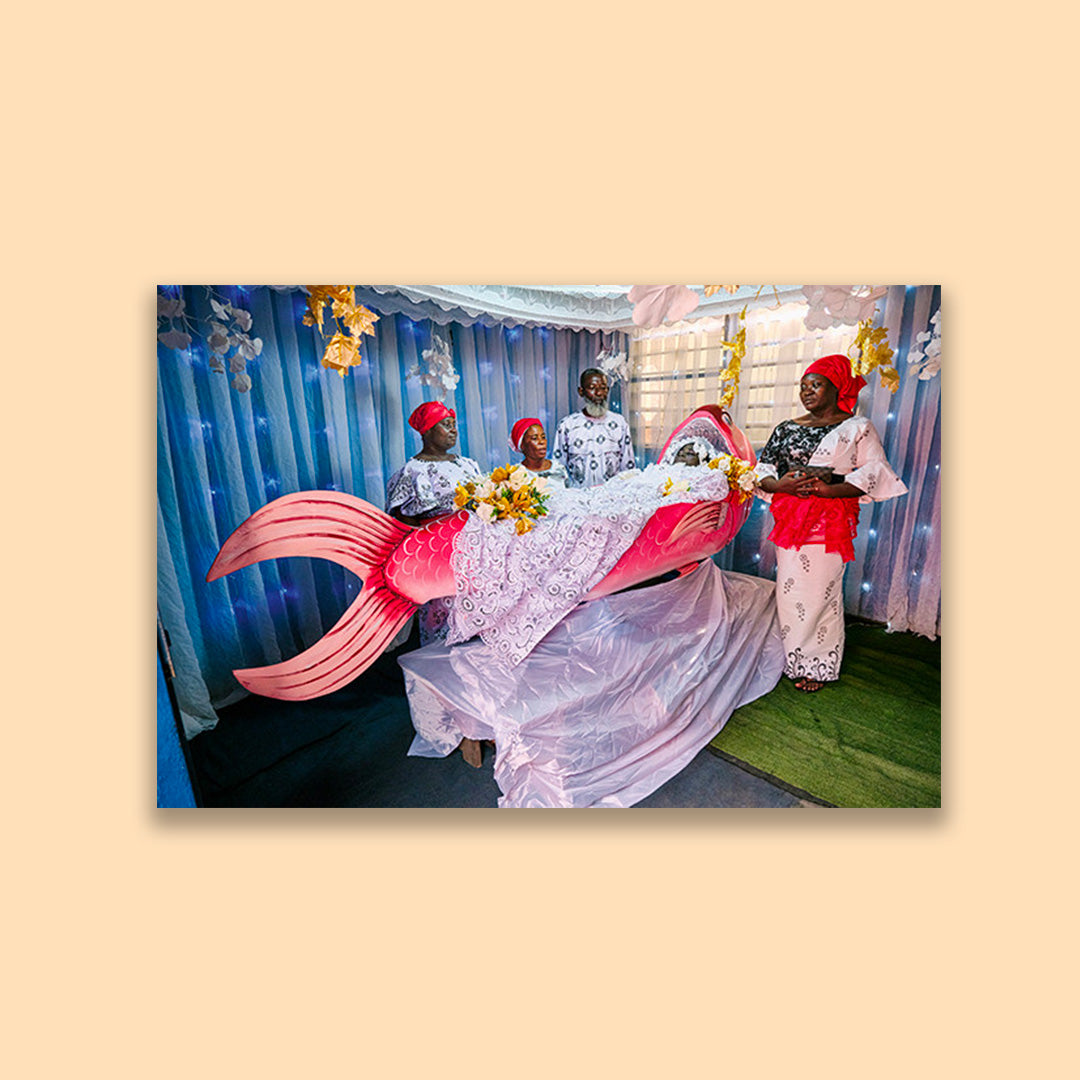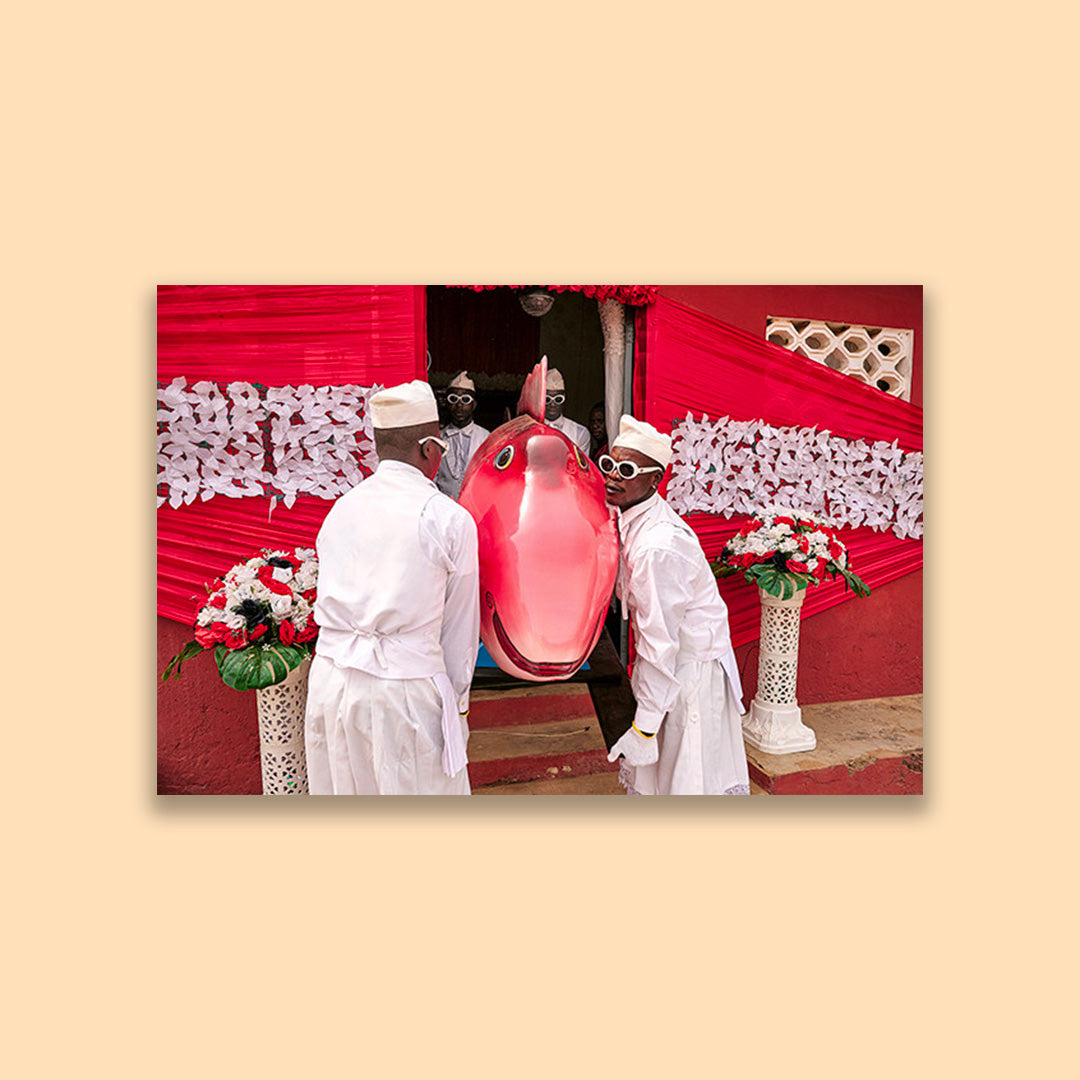 • Théière, poulet, chaussure américaine : les formes de cercueils extraordinaires et la culture d’adieu du Ghana. Célébrer la mort comme on célèbre la vie : tel est le credo de la culture funéraire du groupe ethnique ghanéen Ga-Adangme, où des cercueils créatifs en forme d’animaux, de véhicules, etc., sont utilisés pour représenter les préférences ou les rêves du défunt. De plus, des danses parfaitement chorégraphiées transforment les funérailles en célébrations colorées et énergiques. Depuis plus de vingt ans, Regula Tschumi, titulaire d’un doctorat en ethnologie, étudie et photographie le culte funéraire ghanéen. Ses images étonnantes et aux couleurs vibrantes représentent des cérémonies funéraires chrétiennes et traditionnelles, des installations bizarres et diverses formes de présentation des défunts, ainsi que les tendances spectaculaires en matière de conception de cercueils figuratifs au cours des deux dernières décennies. Tschumi a également accompagné et photographié l’entrepreneur de pompes funèbres et le porteur de cercueil Benjamin Aidoo (connu sous le nom de « Danseur de cercueil du Ghana »), devenu mondialement célèbre grâce aux médias sociaux. Dans le sud du Ghana, une attention particulière est accordée aux enterrements, notamment chez les Ga. Pour ce groupe ethnique, les funérailles comptent parmi les rites de passage sociaux et spirituels les plus importants. Les cérémonies, qui durent souvent plusieurs jours, sont de grands événements publics conçus non seulement pour honorer les morts, mais aussi pour maintenir la réputation d’une famille et assurer la bonne volonté des futurs ancêtres. Les familles visent à impressionner et à divertir les invités : des salles d’exposition somptueuses, des cercueils uniques et des présentations spectaculaires jouent tous un rôle. Cet accent culturel mis sur le spectacle a stimulé l’innovation en matière de conception de cercueils, de performances et de décor funéraire, faisant des funérailles ghanéennes un mélange unique de rituel, d’art et de fierté communautaire. Le monde de l’art international a d’abord remarqué les cercueils figuratifs du Ghana lors de l’exposition Magiciens de la terre au Centre Pompidou à Paris en 1989. Depuis lors, ces cercueils sculpturaux, initialement fabriqués par les artistes Ga Ataa Oko Addo et Kane Kwei, sont devenus une forme d’art dynamique, adoptée dans tout le Ghana et admirée dans le monde entier. « Enterrement avec style » présente non seulement la documentation vivante de Regula Tschumi sur ces pratiques funéraires uniques, mais retrace également leur transformation à travers les générations, notamment le travail de l’artiste célèbre Paa Joe et de ses apprentis.