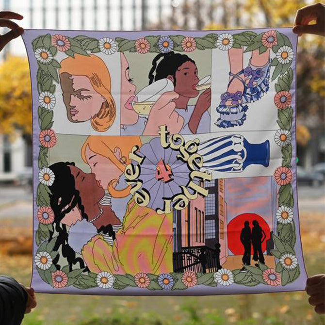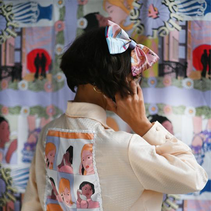 Tous les articles de cette collection ont pour but de convoquer le monde de Melek, ses personnages et leurs tenues dans nos vies et de nous permettre de porter sa poésie sur nos corps. La collection comprend plusieurs pièces fabriquées à partir de tissus en soie imprimés sur mesure, ainsi que des pièces chinées que nous avons modifiées par de petits changements ainsi que par des patchs en soie. Chaque pièce a été méticuleusement cousue et fabriquée par nos propres mains ! Nous espérons que vous aimerez cette collection autant que nous, et nous sommes impatients de vous voir la porter ! Conçu et réalisé en collaboration avec la publication Together, publiée par Colorama en décembre 2020. Illustrations de Melek Zertal. Concept, création de motifs et production par Corinne Schlichting et Johanna Maierski.