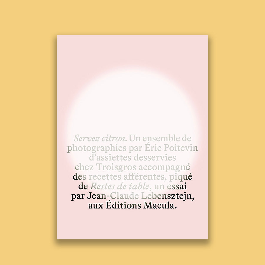 Servez citron. Un ensemble de photographies par Eric Poitevin d'assiettes desservies chez Troisgros accompagné des recettes afférentes, piqué de Restes de table, un essai par Jean-Claude Lebensztejn