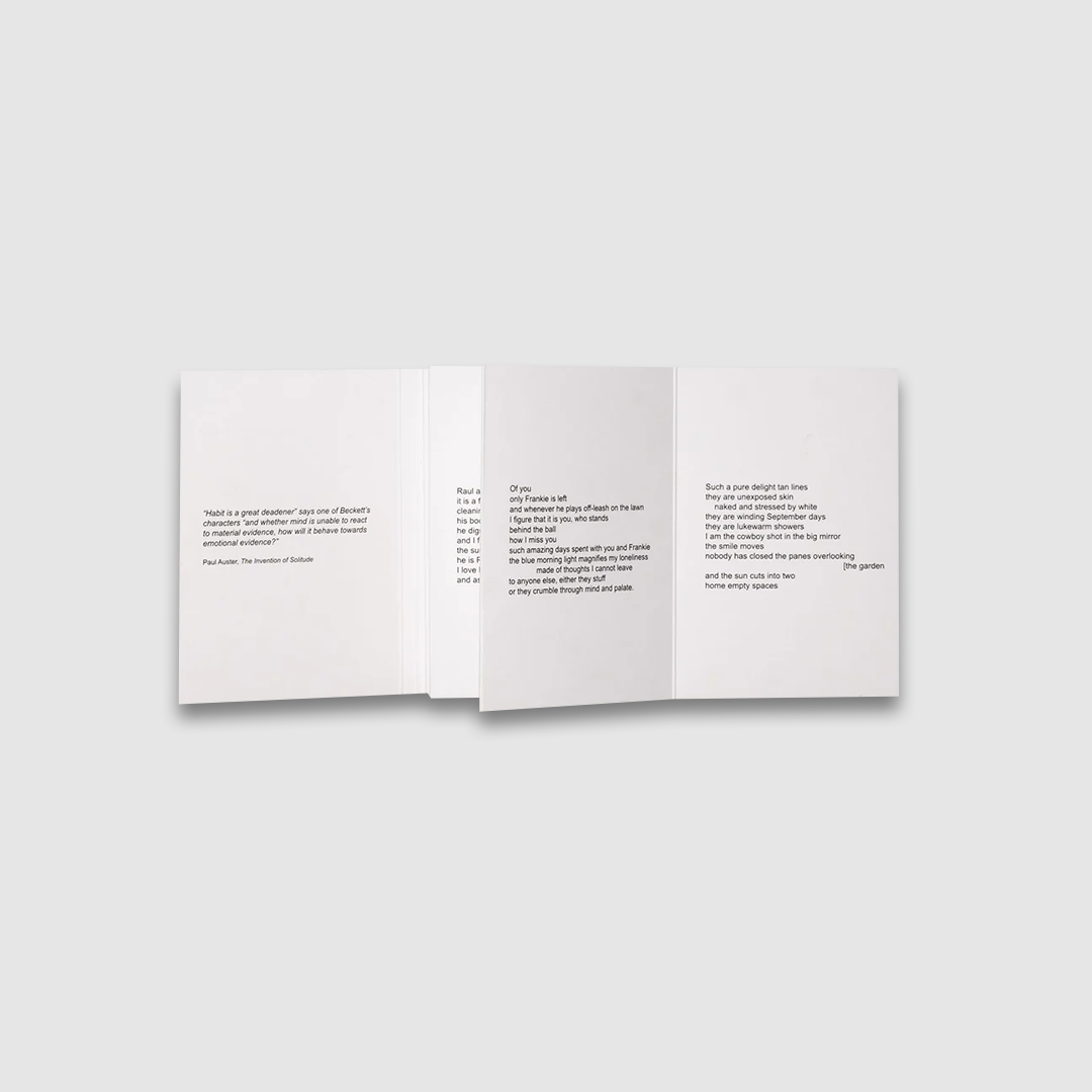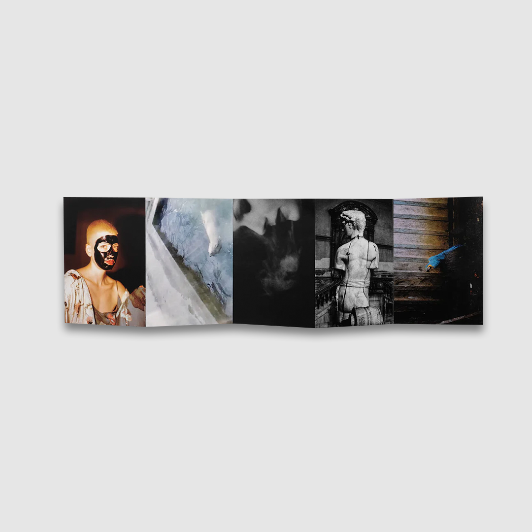 \nThe five booklets, protected by a slipcase, recall the accordion-folding postcards, very popular until a few years ago, and can be read individually or as stages of human life. From birth to death, through youth and maturity: childish lightness, preadolescence, the difficulty of deciphering desire, the feeling of lack. Poetic words welcome photography; together, they become postcards of the emotional places that inhabit the human.