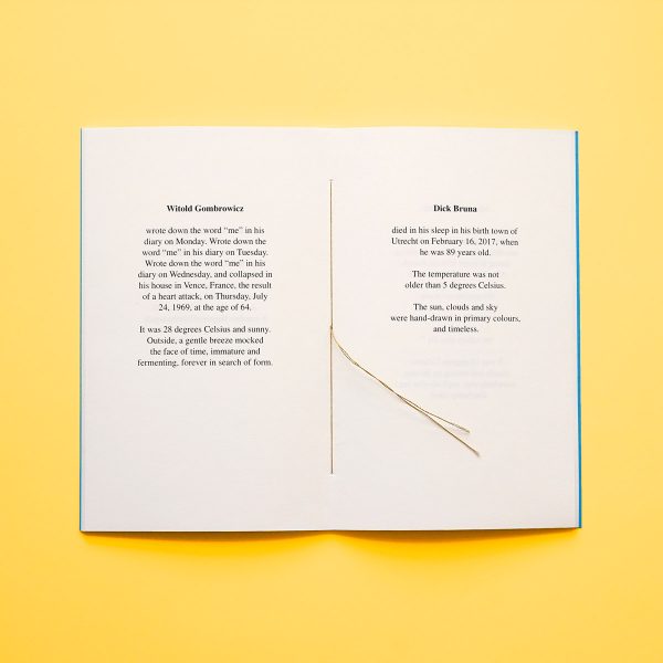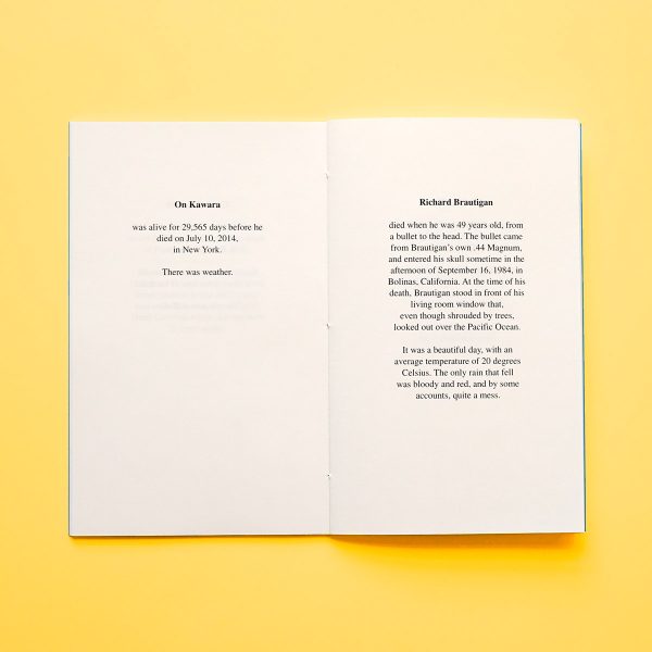 The Weather est un recueil de 41 notices nécrologiques d'artistes, d'écrivains et de musiciens, associées au bulletin météorologique du jour de leur décès. Parmi les personnes figurant dans ce livret figurent Ernest Hemingway, Bas Jan Ader, On Kawara, Sylvia Plath, Robert Walser, Marguerite Yourcenar, Billie Holiday, Curtis Mayfield, Gil Scott-Heron et d'autres encore.