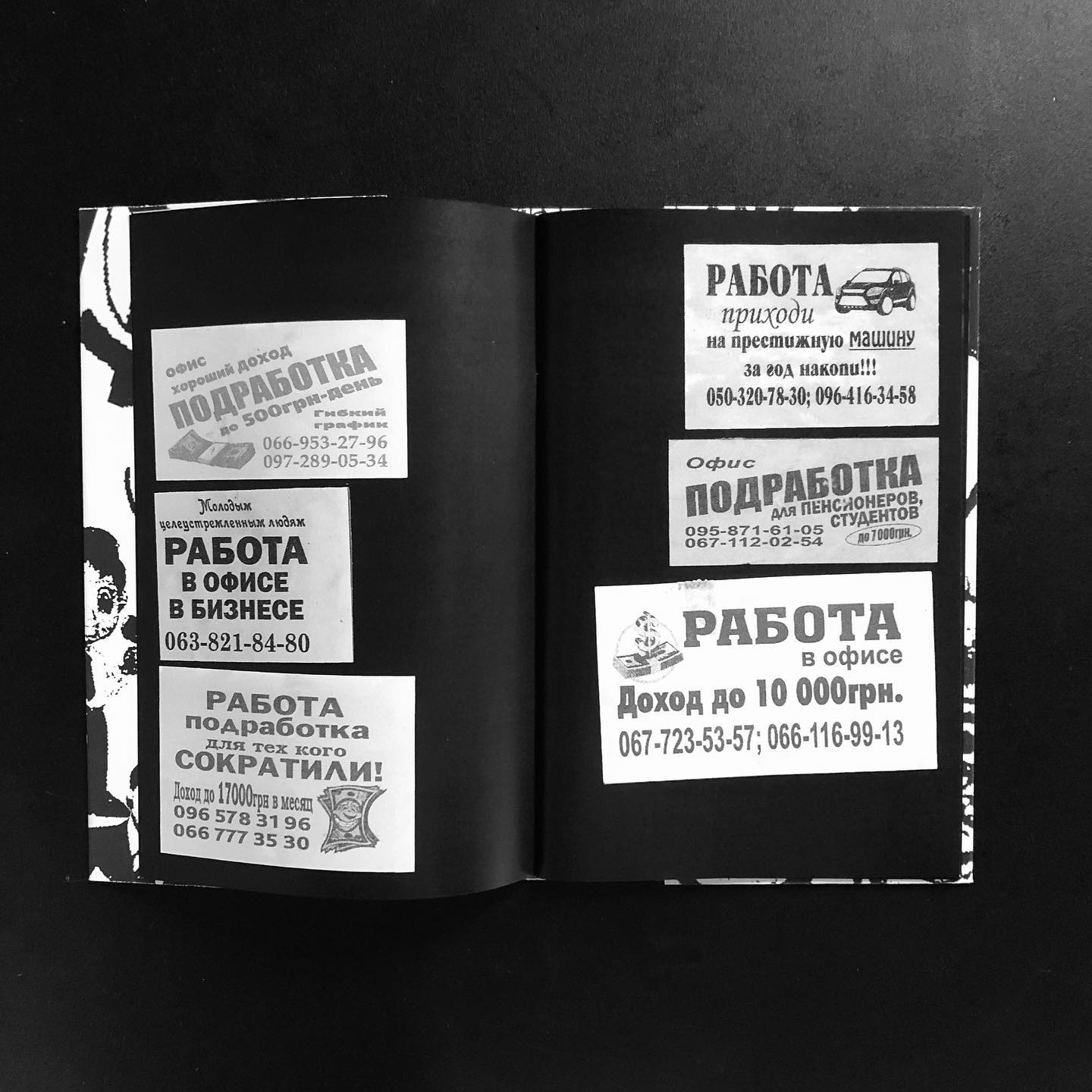 “Работа” un zine regroupant une archive de flyers d’offre d’emploi Ukrainens collectés en 2019 entre Kiev, Dnipro, Kharkiv et Kryvyï Rih.