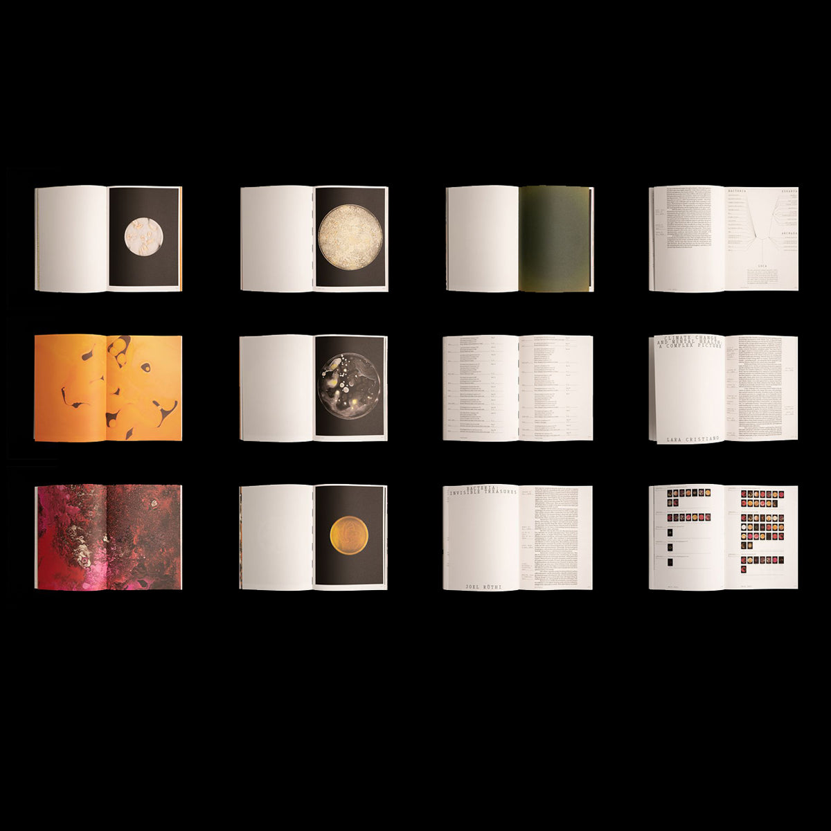 Unearthed - Ces microbes ont été préservés pendant des millénaires à des températures inférieures à zéro dans un écosystème unique que le changement climatique a maintenant mis en péril. Des scientifiques de l’Institut fédéral suisse de recherche sur la forêt, la neige et le paysage WSL ont prélevé des échantillons pour les étudier dans des conditions artificielles. L’artiste suisse a amené certains de ces microbes du laboratoire à son atelier, où elle les a cultivés et photographiés dans leurs boîtes de Pétri. Elle surveillait leur évolution rapide et aléatoire. De nulle part, la vie s’épanouissait soudainement, les formes et les couleurs changeaient constamment jusqu’à épuiser les ressources. Ces compositions abjectes et attrayantes sont devenues des sujets visuels incontrôlables. La publication présente des textes de scientifiques du WSL ainsi que des essais historiques, psychologiques et sociologiques. Les informations sur les micro-organismes et leurs capacités et occurrences spéciales donnent au lecteur l’occasion de connaître les protagonistes des images ; textes de Ivano Brunner, Lara Cristiano, Beat Frey, Marcia Phillips, Joel Rüthi, Jonas Schnydrig, Beat Stierli et Larissa Tiki Mbassi, photos en couleurs.