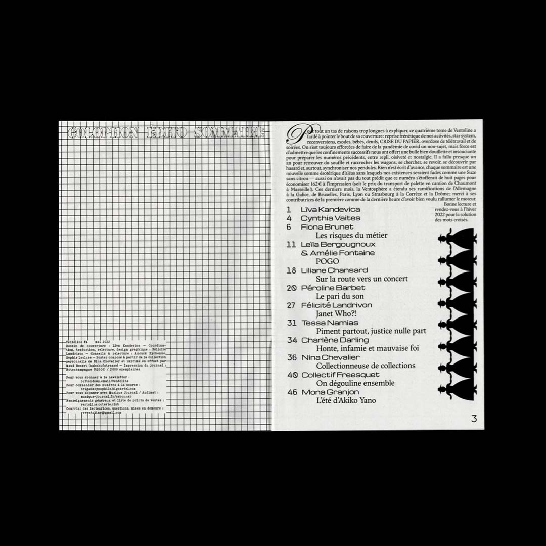 Ventoline #4 - Ventoline is a music fanzine written and illustrated by women. Contributors to this fourth issue were Līva Kandevica, Cynthia Vaites, Fiona Brunet, Leïla Bergougnoux & Amélie Fontaine, Liliane Chansard, Péroline Barbet, Félicité Landrivon, Tessa Namias, Charlène Darling, Nina Chevallier, l'Amicale du Freesquet, Mona Granjon.