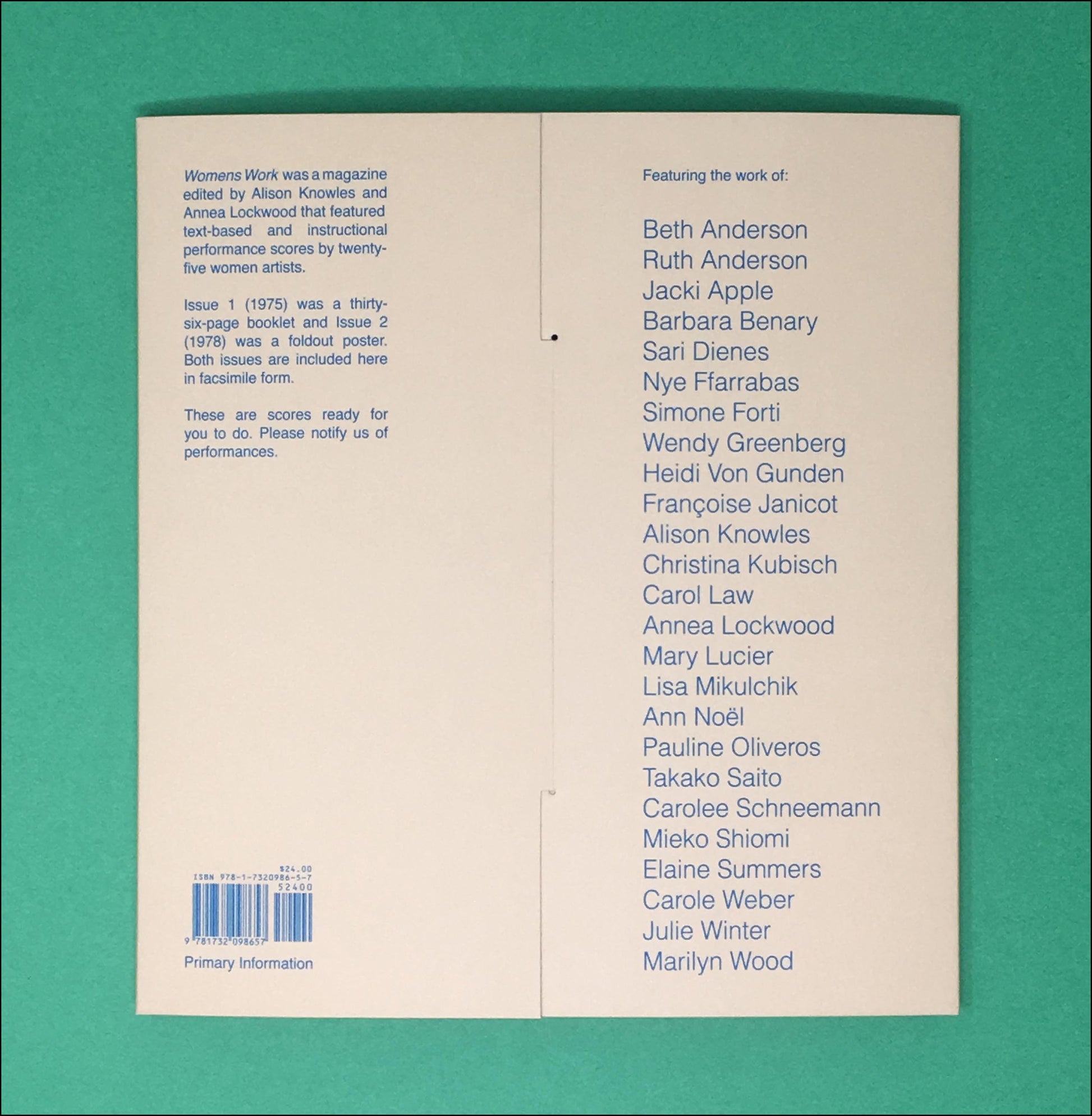 Womens Work - Originally published in the mid-1970s, Womens Work was a magazine that sought to highlight the neglected work of female artists working at the intersection of visual arts, music, and performance. The magazine was edited by Alison Knowles and Annea Lockwood and featured textual and didactic performance scores by the following 25 artists, composers, and choreographers: