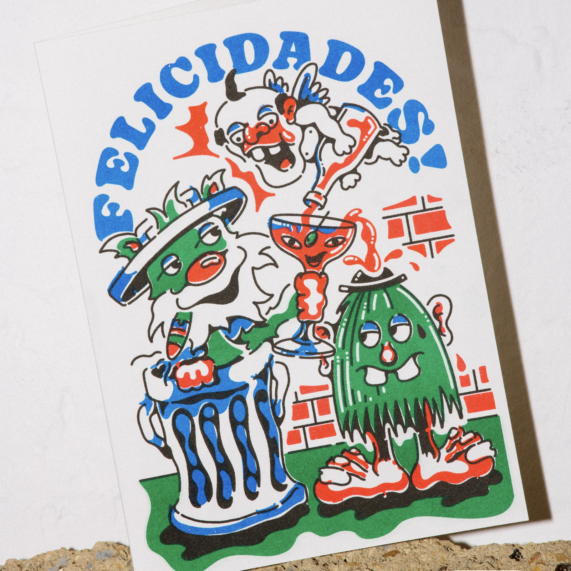A5 size birthday cards! 4 Colour risograph printed Blank Inside 300g Fedrigoni Natural Paper Folded Includes a printed metapaper envelope