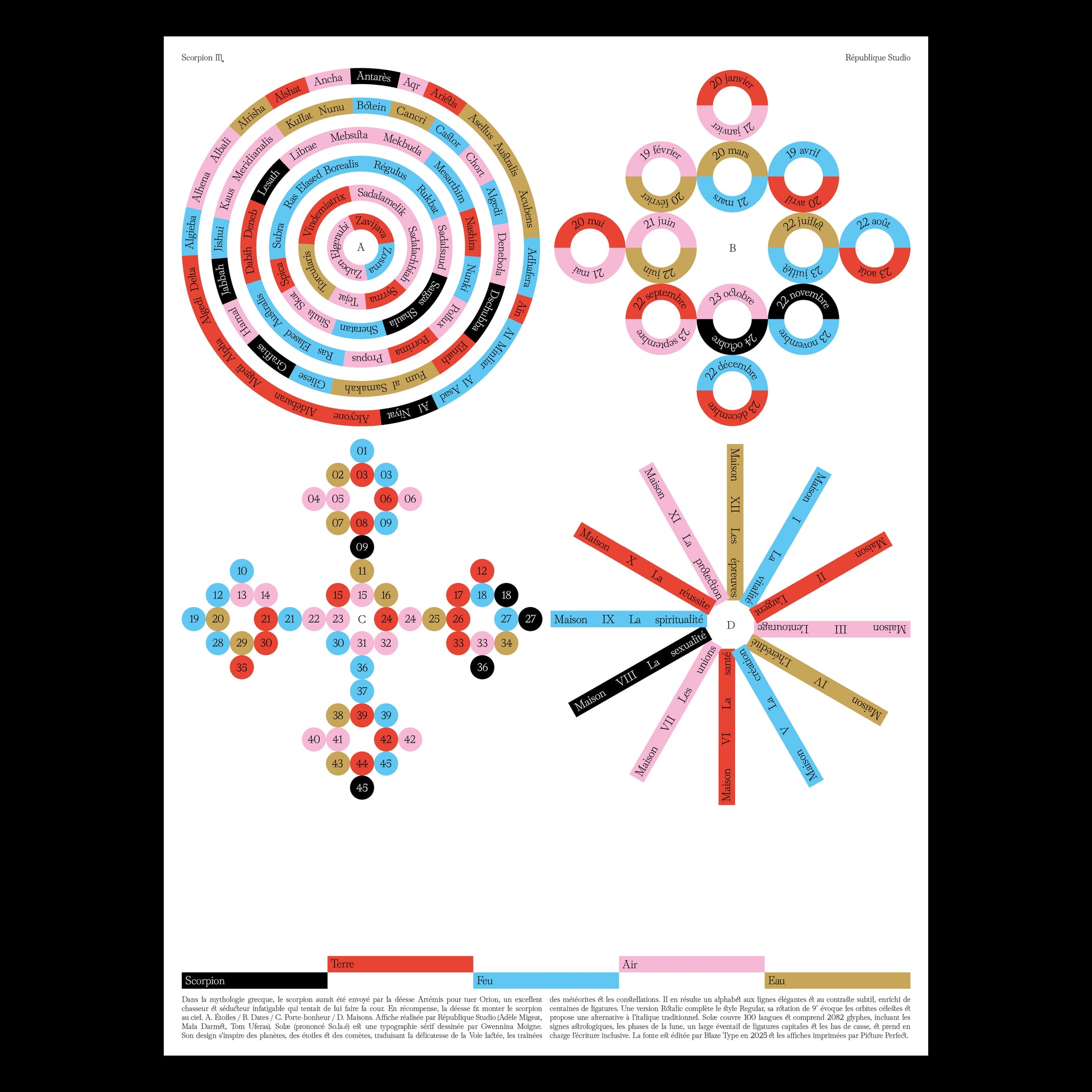 To celebrate the launch of Solæ typeface, I invited 12 designers and studios whose work I admire (Fakepaper, Élise Rigollet, Clémence Gouy, Eschenlauer Sinic, Odds Studio, Choque Le Goff, Pierre Vanni, République Studio, Task Office, Aletheia, Marine Buffard & Maison Solide). Each had carte blanche to create a poster using Solæ and a zodiac sign of their choice. The brief was open, so they could interpret the typeface through their own visual language.