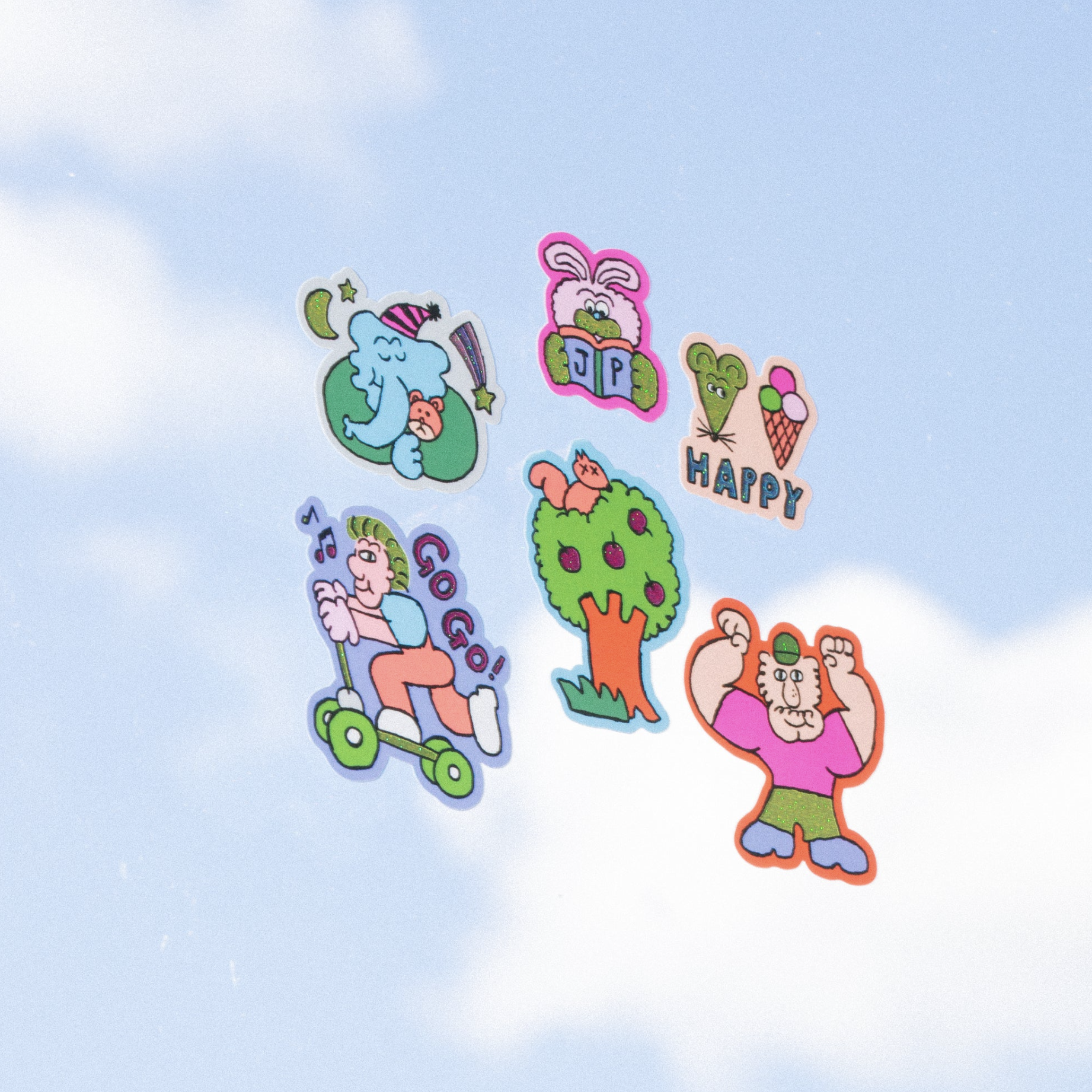Packed in a plastic wallet with risograph sticker on the front and thermal printed sticker on the back.