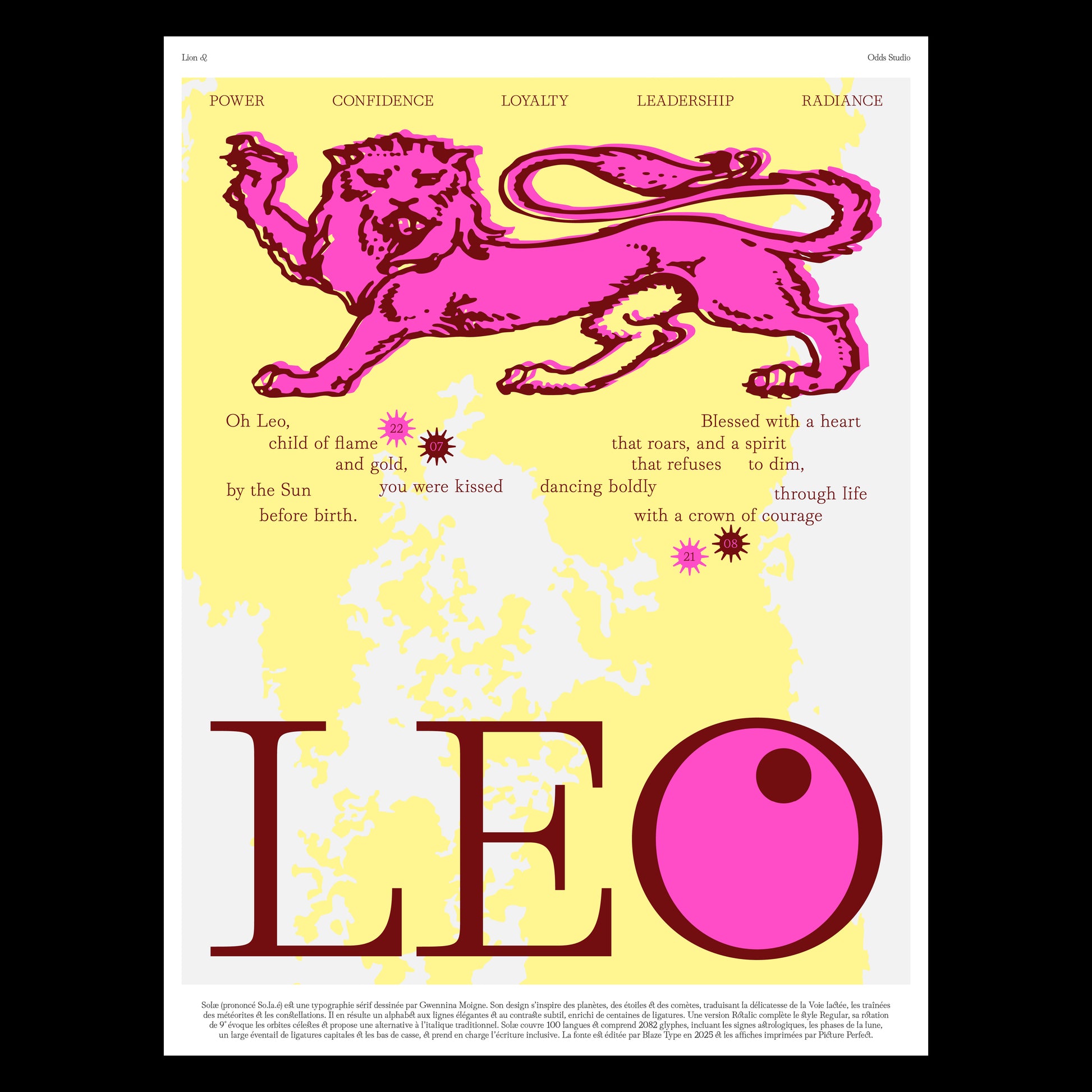 To celebrate the launch of Solæ typeface, I invited 12 designers and studios whose work I admire (Fakepaper, Élise Rigollet, Clémence Gouy, Eschenlauer Sinic, Odds Studio, Choque Le Goff, Pierre Vanni, République Studio, Task Office, Aletheia, Marine Buffard & Maison Solide). Each had carte blanche to create a poster using Solæ and a zodiac sign of their choice. The brief was open, so they could interpret the typeface through their own visual language.
