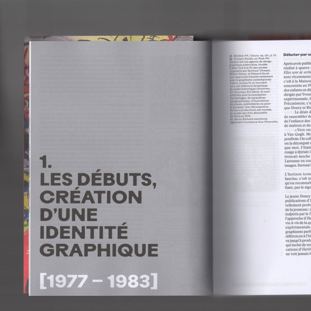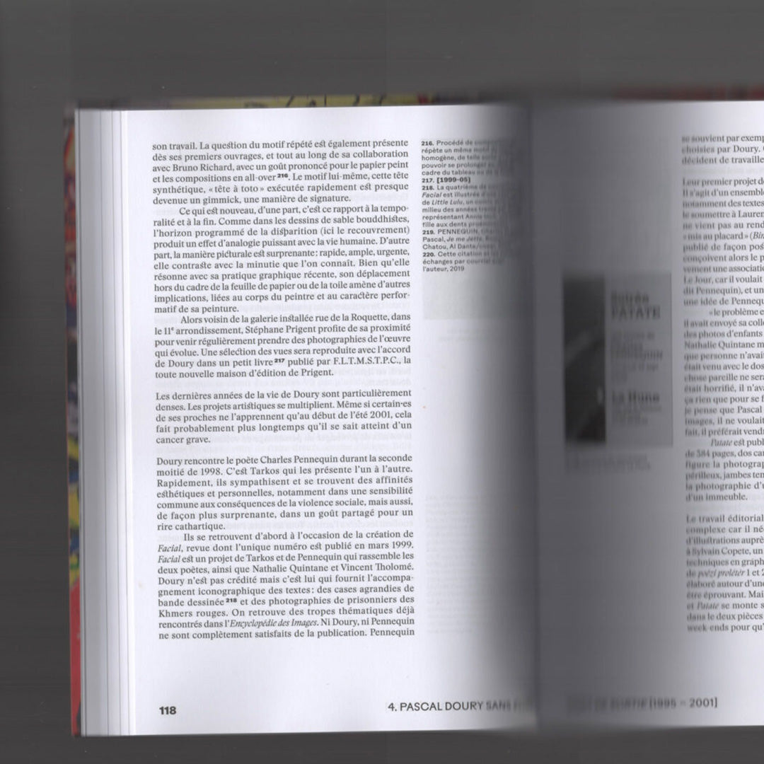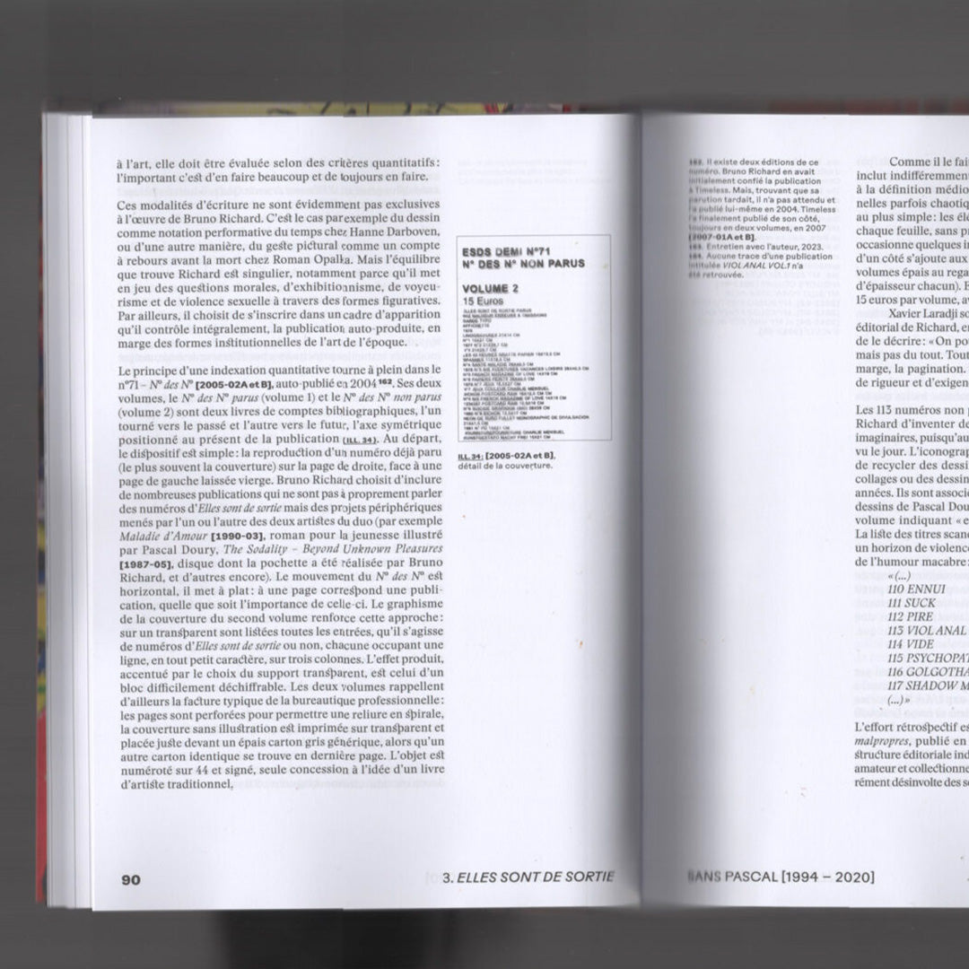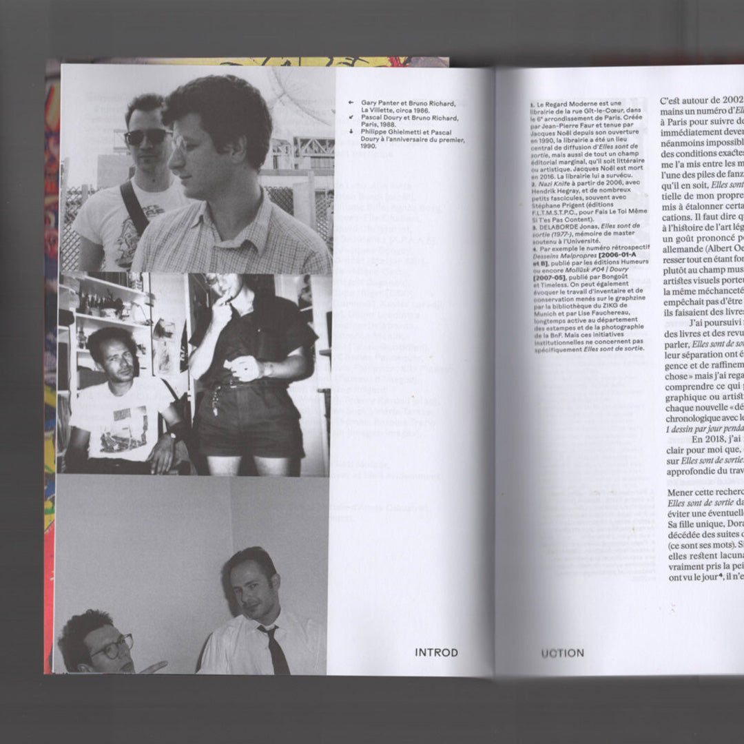 Elles Sont de Sortie est le titre d’une publication périodique publiée à partir de 1977 par Pascal Doury et Bruno Richard. Le pluriel et le genre féminin d’une formule énigmatique, choisie presque par hasard, «elles sont de sortie», annonce une œuvre protéiforme et une expérience souvent collective. Depuis ses origines jusqu’aux itérations les plus récentes, en passant par la trajectoire individuelle plus confidentielle de Doury après Elles sont de sortie, le livre retrace cinq décennies d’un corpus de près de trois cents publications. Il aborde certaines des œuvres éditoriales les plus emblématiques et d’autres encore inédites, ainsi que des expositions ambitieuses et parfois scandaleuses, mais peu, voire jamais documentées.