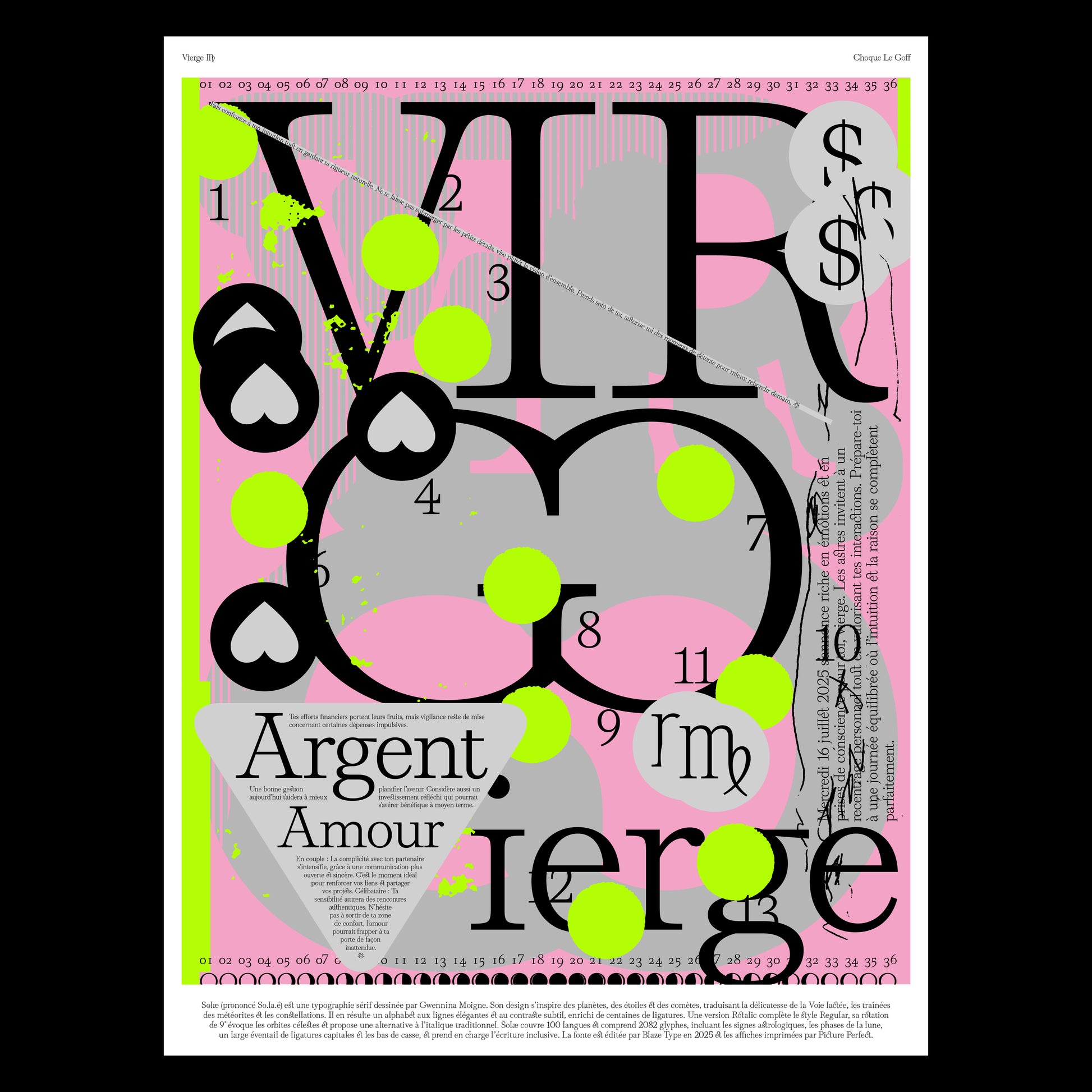 To celebrate the launch of Solæ typeface, I invited 12 designers and studios whose work I admire (Fakepaper, Élise Rigollet, Clémence Gouy, Eschenlauer Sinic, Odds Studio, Choque Le Goff, Pierre Vanni, République Studio, Task Office, Aletheia, Marine Buffard & Maison Solide). Each had carte blanche to create a poster using Solæ and a zodiac sign of their choice. The brief was open, so they could interpret the typeface through their own visual language.