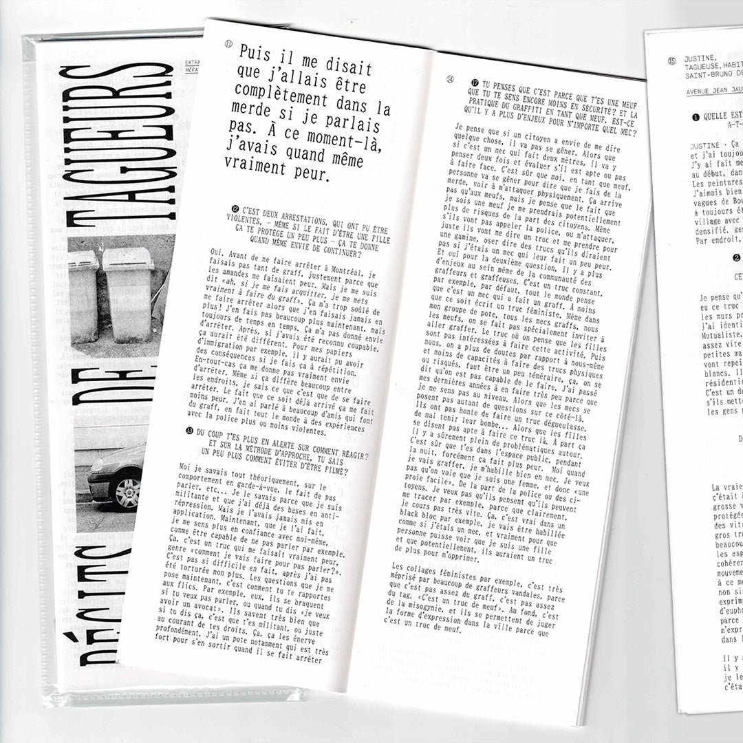 Récits de tagueurs, recueille les retranscriptions d’entretiens qui apparaissent dans l’édition Méfait Accompli. Elle regroupe cinq discussions, qui ont été enregistrées entre avril et juin 2022. À travers divers témoignages, cette édition donne la parole aux tagueurs et tagueuses du quartier de Saint-Bruno, à Grenoble et met également en lumière cette pratique qui questionne d’un point de vue graphique et éthique. En complément des photographies de tags sauvages dans Méfait Accompli, ces échanges permettent de comprendre l’origine et la raison d’existence de ces tags. La conjoncture sociale et politique propre au quartier de Saint-Bruno, liée à des phénomènes de gentrification, donne naissance à de nombreuses réactions militantes et individuelles, qui prennent parfois des formes graphiques telles que celle du tag. Cet acte d’écriture suscite de nombreuses questions, c’est pourquoi, aller à la rencontre de ces scripteurs délinquants nous permet de comprendre un peu plus ce mode de réappropriation de la ville : quel lien entretiennent-ils avec le quartier ? Quels sont les enjeux de l’écriture illégale en tant que femme ? Peut-on parler de violence graphique ? Quelles sont les expériences vécues avec la police, et quel critique émettre des technologies de surveillances ?