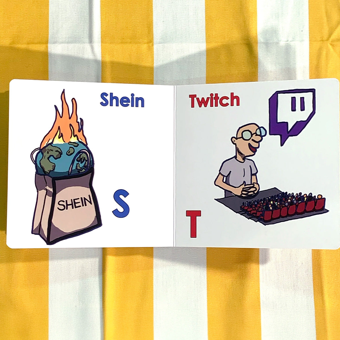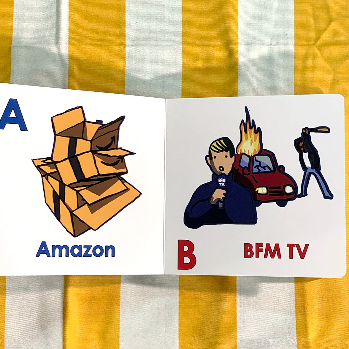 Fini l'ABC avec Arbre, Bateau, Cheval… Ce petit livre cartonné éveillera l'enfant de manière bien plus réaliste à notre société capitaliste. D'Amazon à Zara, les illustrations aident les petits lecteurs et petites lectrices à se repérer dans le monde des adultes.