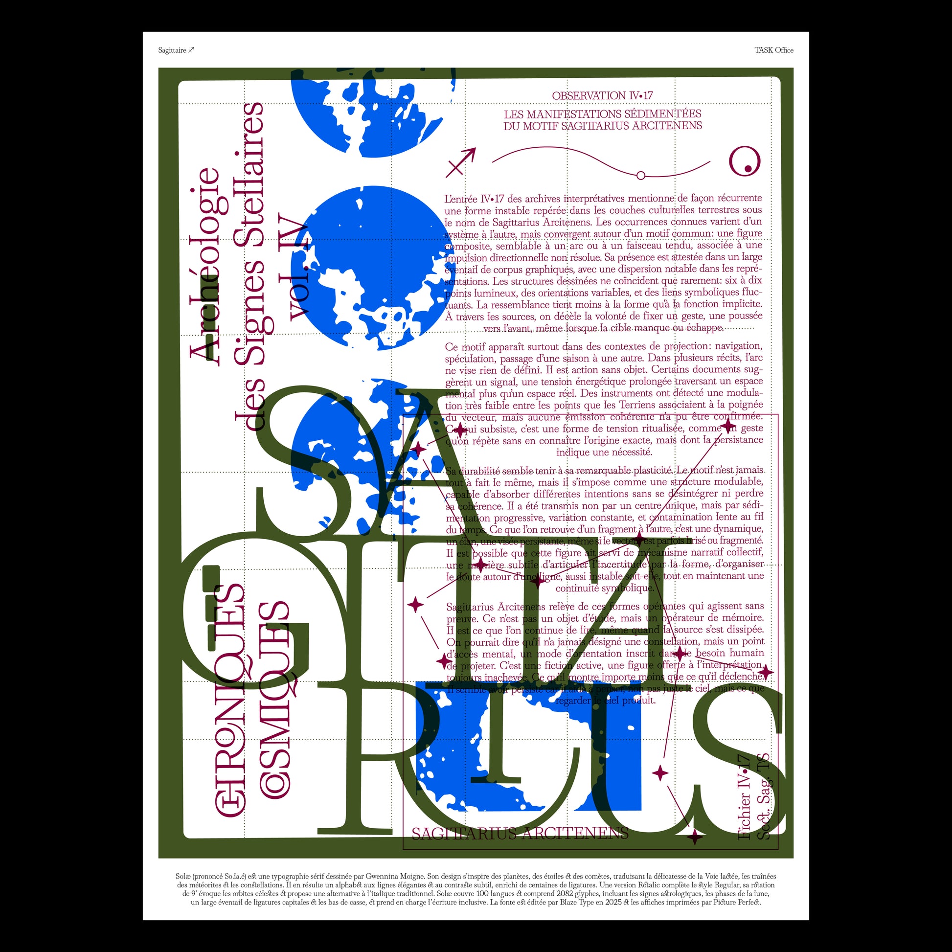 To celebrate the launch of Solæ typeface, I invited 12 designers and studios whose work I admire (Fakepaper, Élise Rigollet, Clémence Gouy, Eschenlauer Sinic, Odds Studio, Choque Le Goff, Pierre Vanni, République Studio, Task Office, Aletheia, Marine Buffard & Maison Solide). Each had carte blanche to create a poster using Solæ and a zodiac sign of their choice. The brief was open, so they could interpret the typeface through their own visual language.