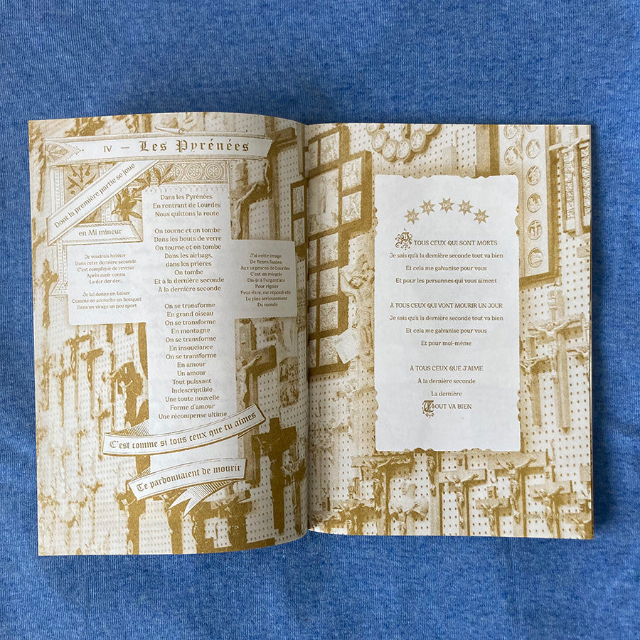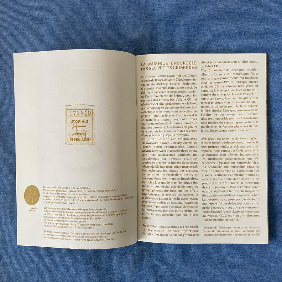«Mon album est toute ma vie. Sans exagérer, c’est le concentré de mon âme, mon vécu, mes propres ténèbres balayées par mes espoirs, mon rapport à l’existence et à la mortalité dont elle est indissociable, les incursions paranormales que j’y rencontre. J’y ai mis tout mon savoir-faire, ma sensibilité, ma musicalité, toute la folie de compositrice et l’exploration que je me suis autorisées, tout mon temps et mon argent sur une demi-décennie de production. Franchement, il mériterait de sortir sur vinyle. Mais cet article noble et ultra stylé est-il le meilleur moyen de faire exister matériellement mes chansons? La question ne se pose pas car de toute manière je n’ai pas de budget pour ça. J’ai préféré concevoir cet ouvrage — un song- book? Un zine? —, mon plus fervent hommage au livret du CD. C’est mon grimoire, mon portail interdimensionnel.» Léa Jacta Est