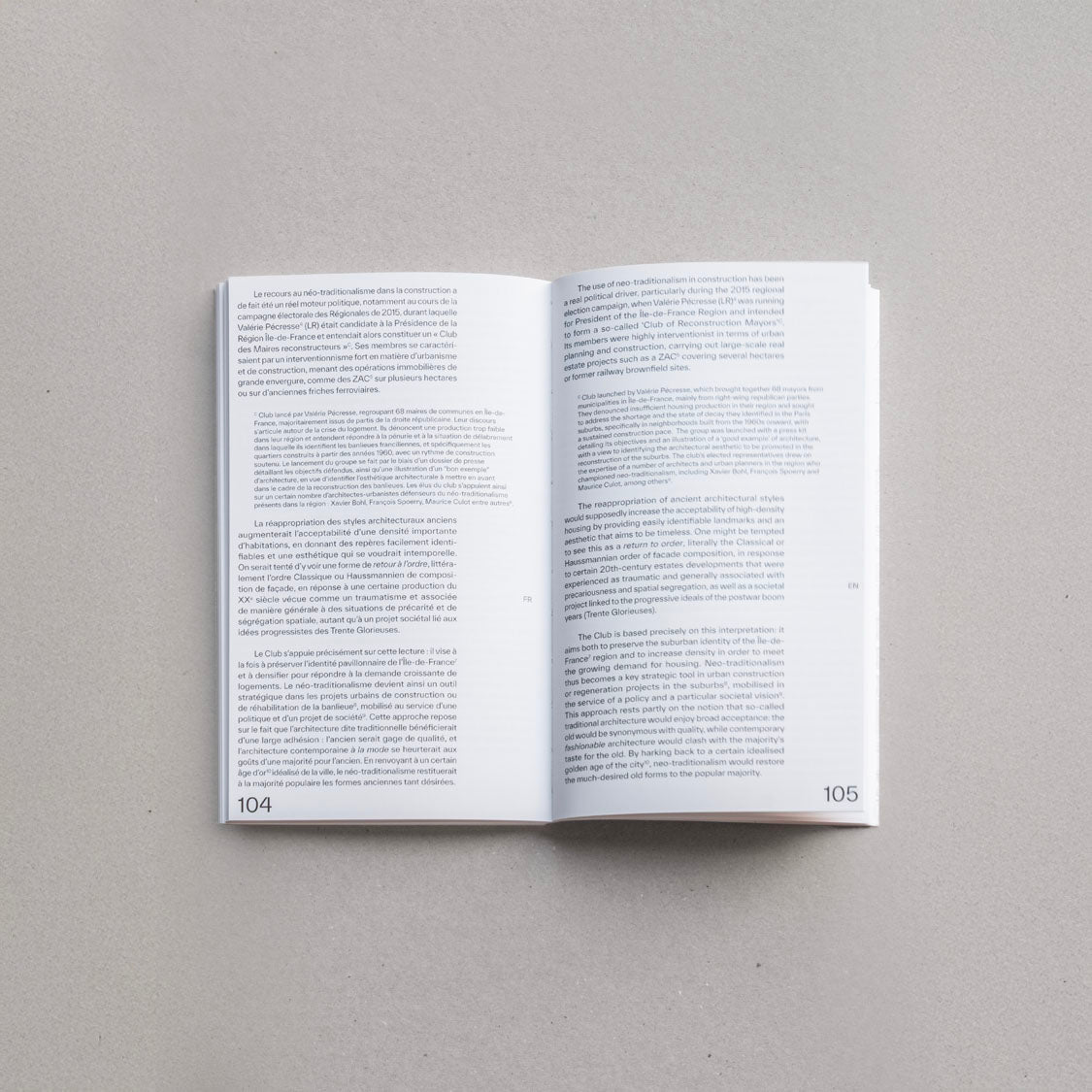 « Aliquando et insanire jucundum est » Il est parfois bon d’avoir un grain de folie. Cette maxime qui orne la façade du Théâtre de l’Allegria au Plessis-Robinson, symbolise une architecture néo-traditionnaliste qui s’empare de certains quartiers du Grand Paris. Entre 2021 et 2025, Élise Helm et Édouard Fargues ont documenté ces paysages urbains hybrides, où passé et présent se rencontrent. Avec 120 photographies, une postface de Charlotte Carles et une illustration d’Aurélie Renault, l’ouvrage invite à contempler et à réfléchir sur la ville contemporaine et ses imaginaires.