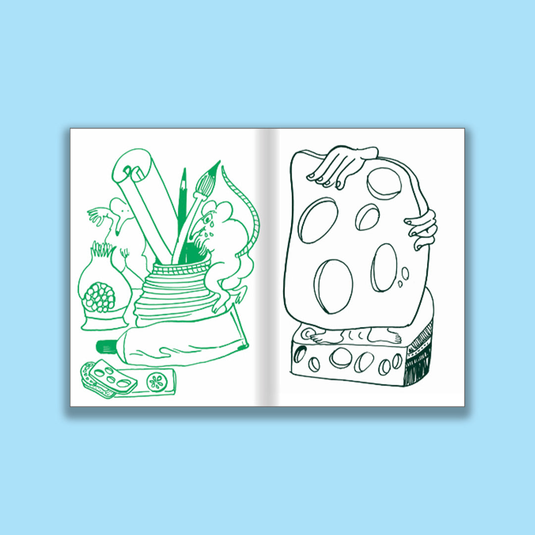 Olga Prader’s colouring book presents a series of 47 still life drawings and introduces the reader to the cabinet of a ordinary collector. Faced with the dilemma of how to fill their interior and to organise their world, the owner uses the collection to display their knowledge and vanity. It is a tad bric-a-brac inspired by Korean still life (Chaekgeori), cabinets of curiousities, and the art of drapery. The book is printed in two panton colours. Even more frills.