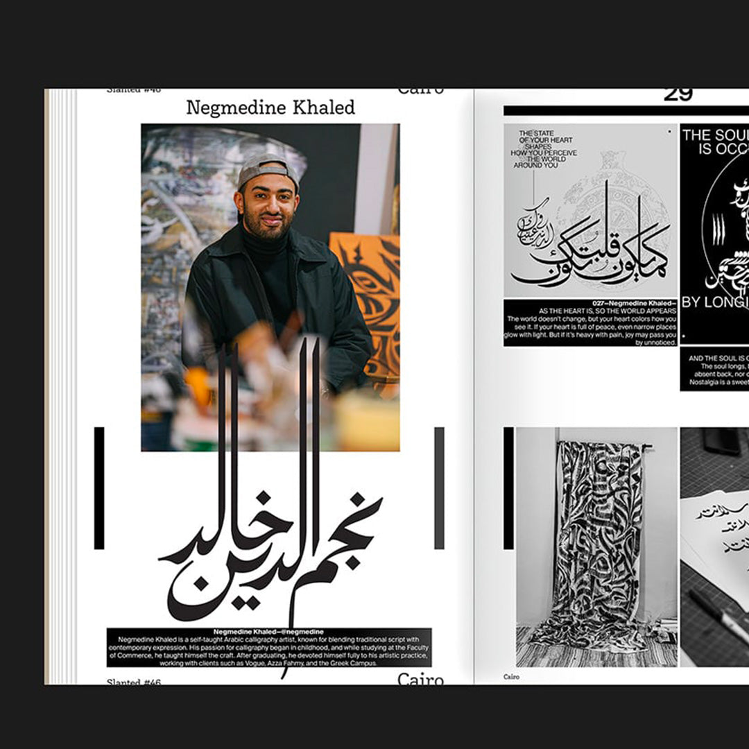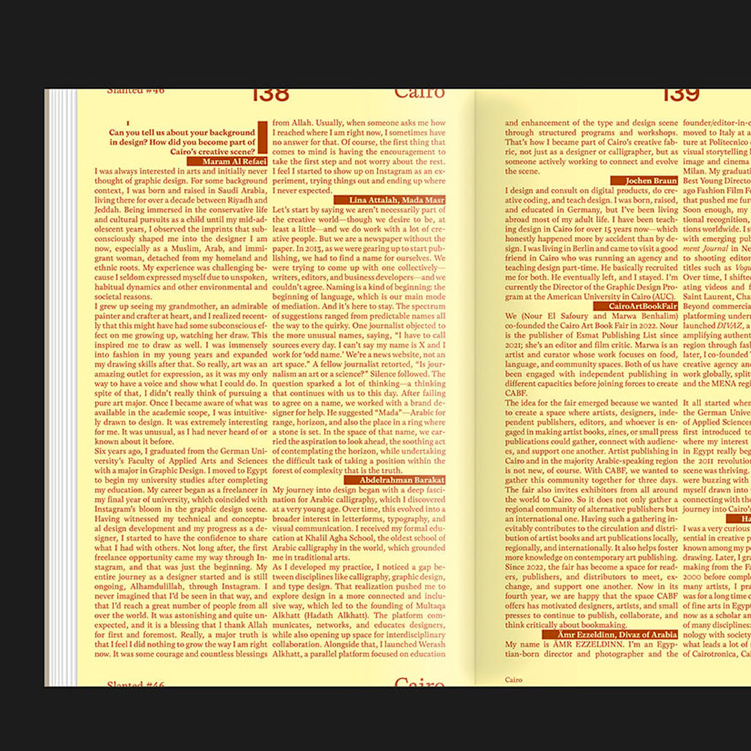 'Slanted 46: Cairo' is a visual journey into Egypt’s vibrant creative scene. The issue highlights the diversity, innovation, and power of Cairo’s design culture and beyond. From graphic design, typography, and visual communication to architecture and product design, it features outstanding projects shaping the region’s cultural present and future. With progressive branding, experimental approaches, and strong visual storytelling, 'Slanted 46' reflects Egypt’s creative energy. Designers, illustrators, and artists from Cairo and beyond share their work and voices. In-depth essays and interviews explore cultural, social, and creative topics, offering a bold, fresh portrait of a design scene in motion.
