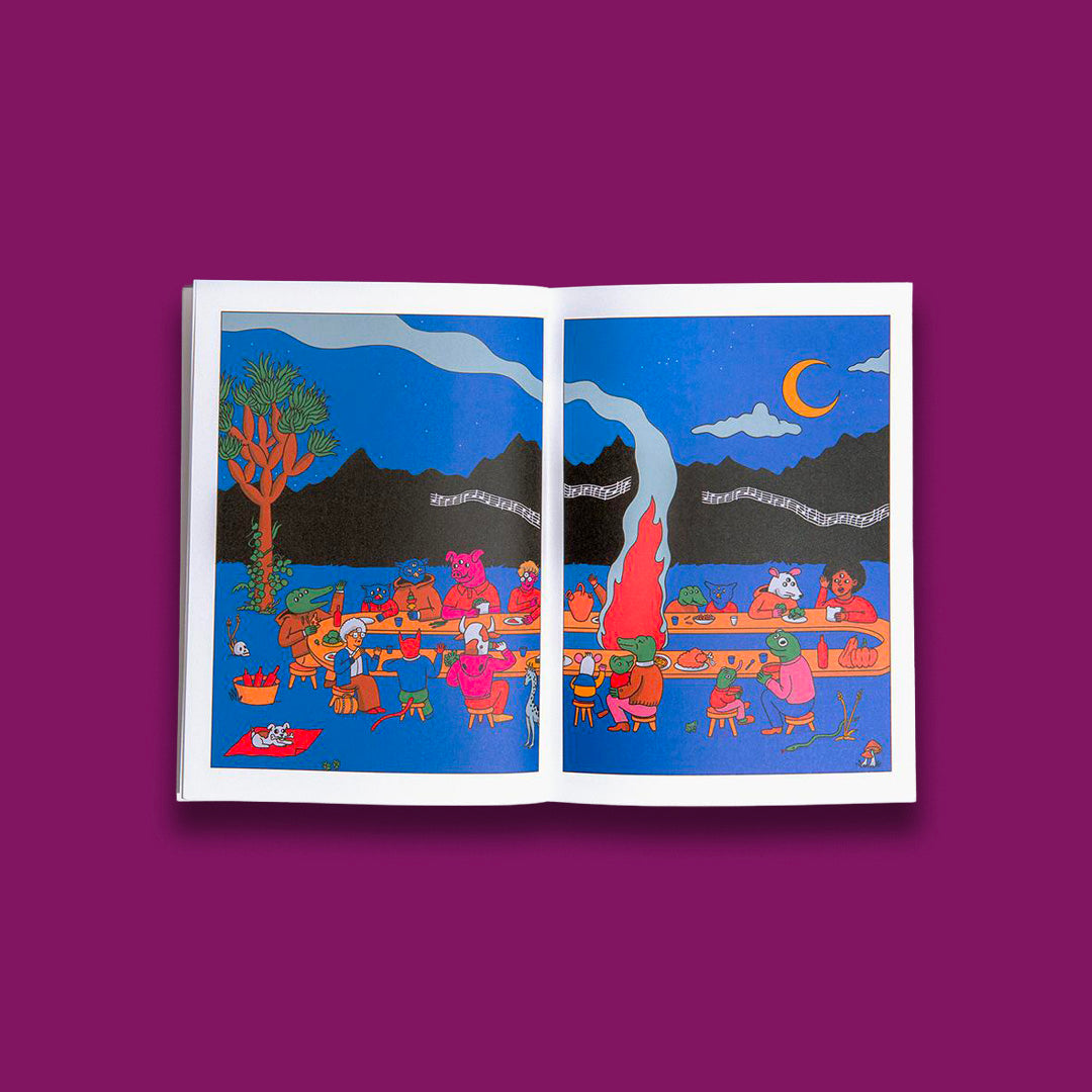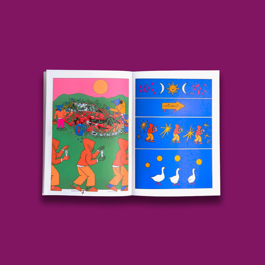 Sowing, like music or the digital world, requires strong community relationships based on care. The end of autumn draws heavily on these common and collected rhythms, that range from play to procession, all present in Mute. In this comic, Miriam Persand reflects on the dissemination of information, listening, and companionship, returning to the utopian ideas that characterized the early internet. Thanks to her, we can share, along with the characters we discover throughout this story, an autumnal multi-species banquet.