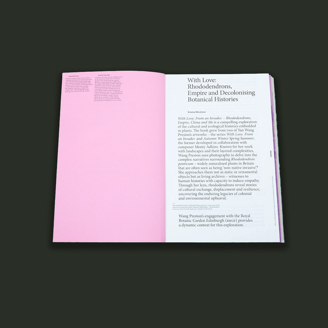 'With Love. From an Invader. – Rhododendrons, Empire, China and Me' is an intensive field study. Every other day for a year, Yan Wang Preston (CN/GB) went to a particular love-heart-shaped 'Rhododendron ponticum' shrub and photographed it. In the process she also found a thriving ecology with the rhododendrons as the key stone species. British rhododendrons are all introduced plants, brought from southern Europe and East Asia for science and horticulture. Although still common and a much-loved sight in most British gardens, it is often labelled as non-native invasive. The contested perceptions of rhododendrons suggest that politics is at play within the apparent objectivity of science. The book is a love letter from a non-native species to the cosmopolitan ecology of contemporary Britain.