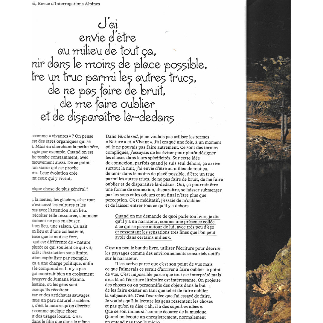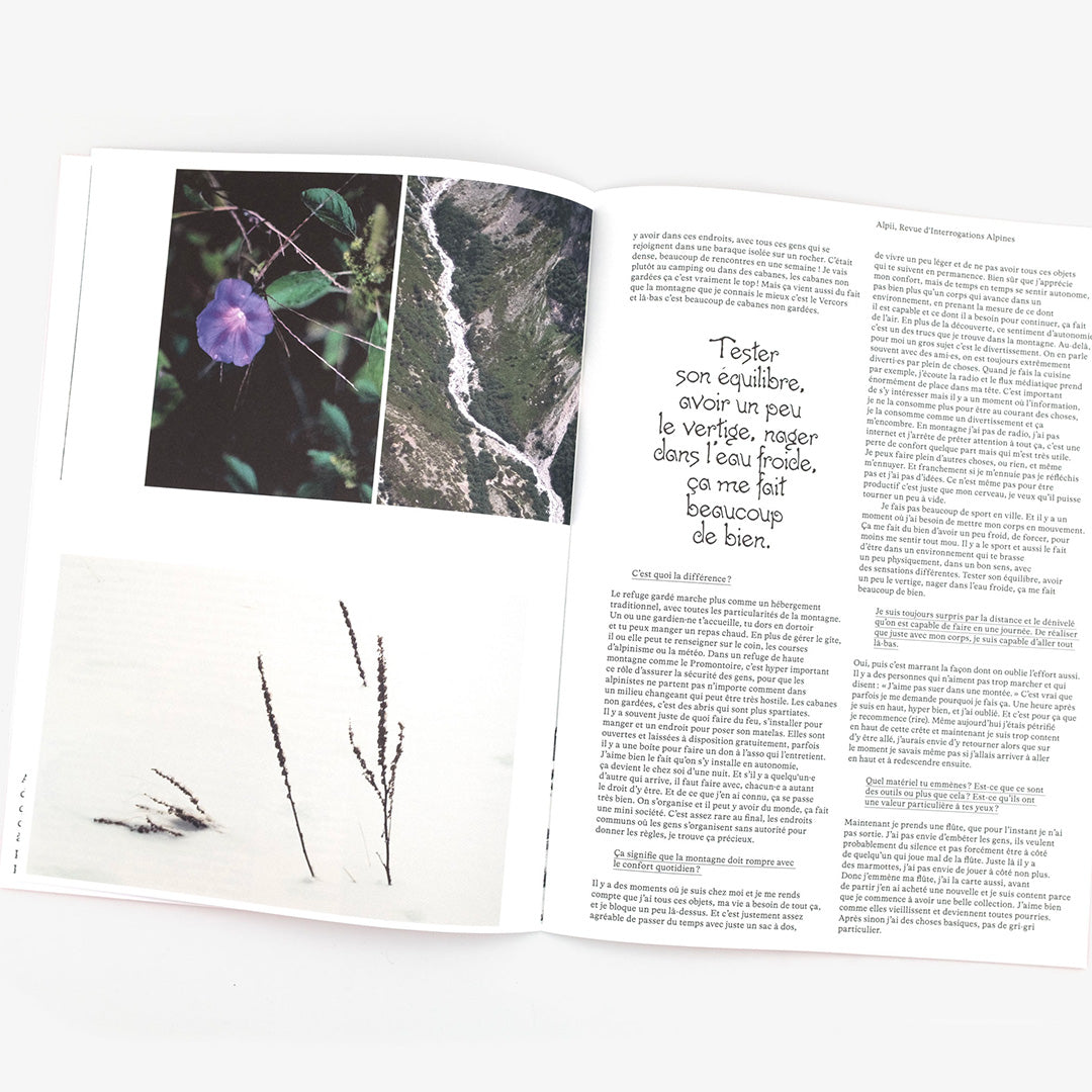 Sans performances ni aventures, Alpii considère la montagne comme un lieu réceptacle de motivations individuelles diverses mais communes à nombreux d’entre nous. Elle interroge de manière large la relation esthétique, symbolique, au travail, à l’organisation quotidienne ainsi que le lien au vivant, à l’autre, à l’expérience physique, à l’équipement et à la nourriture que chacun cultive en montagne.