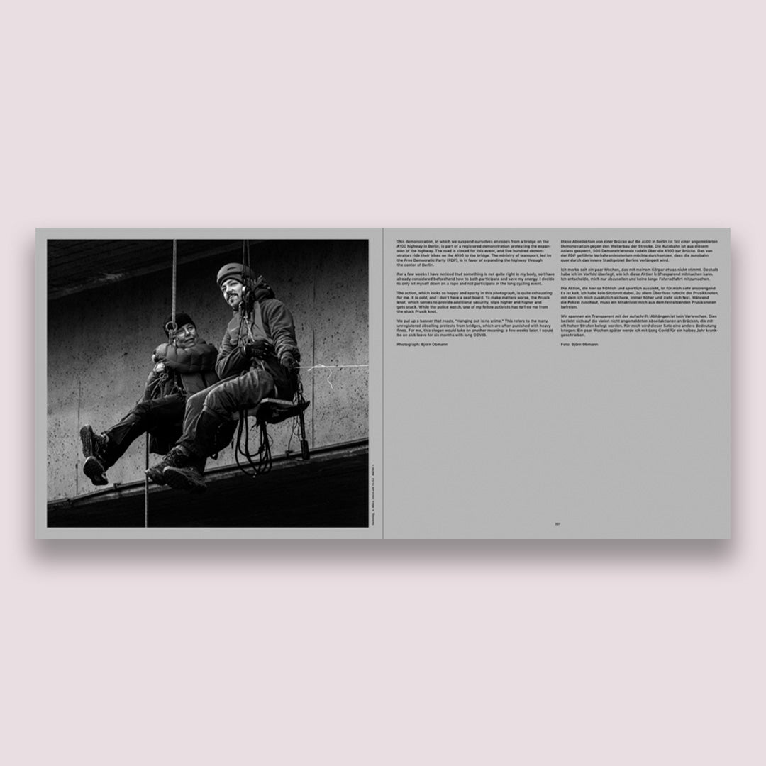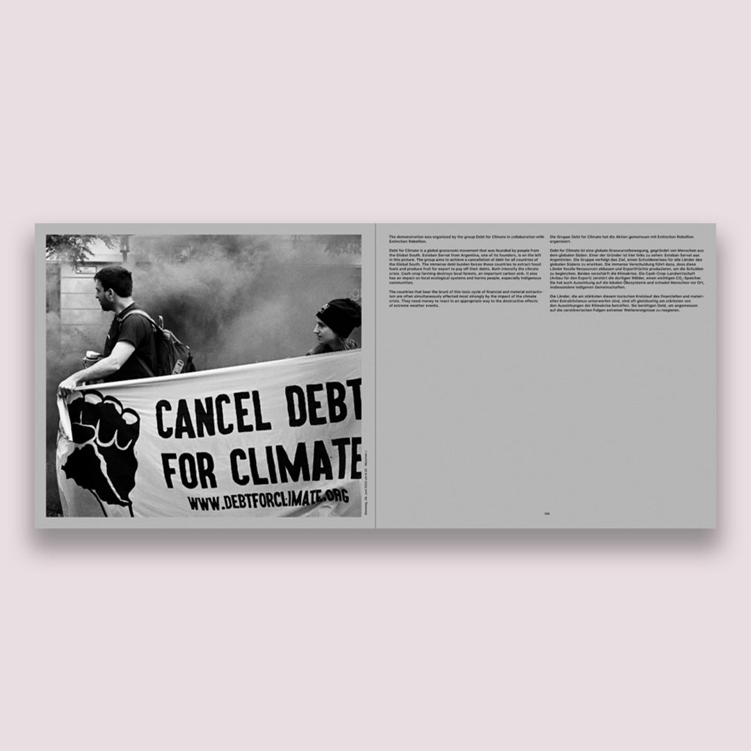 People on the brink, depopulated areas, desolate villages—it only becomes clear after a second glance that Beate Gütschow’s photos show protests, reconstruction work after catastrophic flooding, and the impact of forest fires on villages and landscapes: dystopian events that have happened in the recent past, and in Central Europe at that. It is not until weeks after the events that Gütschow arrives in the places concerned. Her long-term photographic studies give rise to counter-images to set against the usual depictions of disaster. These are more tranquil images that are emotionally accessible and make it possible for events to be analyzed. Gütschow is also part of the climate justice movement. Here, she participates in and records what she finds, documenting actions, occupations, and demonstrations: an interior perspective in which the photographs combine with diaristic notes to create a composition of text and images.